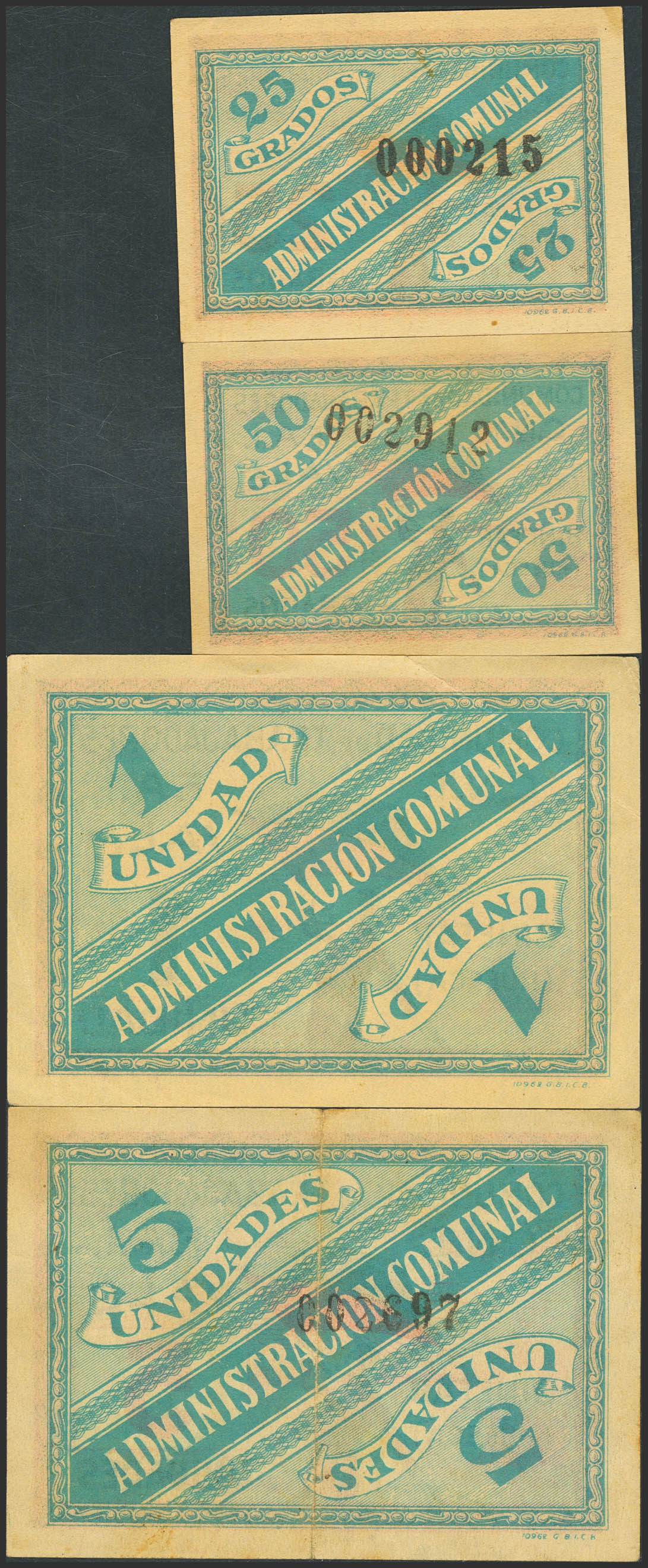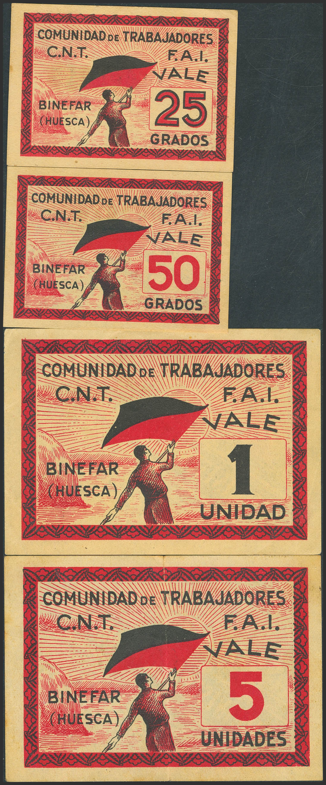 BINEFAR (HUESCA). 25 Grados, 50 Grados, 1 Unidad y 5 Unidades. (1937ca). (González: 1217, 1218, 1219, 1220). Muy raros, especialmente en esta calidad. SC--/EBC-.