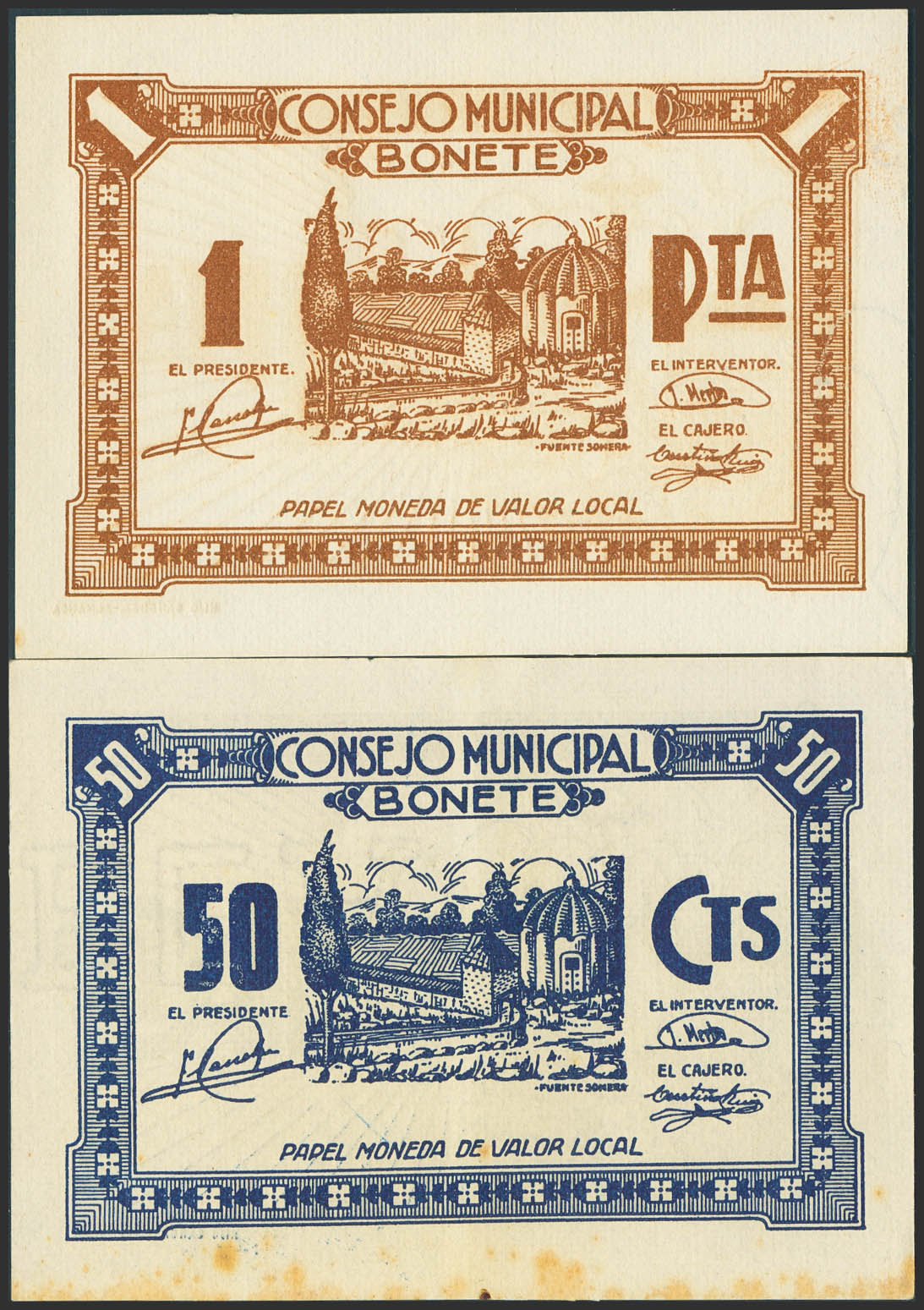 BONETE (ALBACETE). 50 Céntimos y 1 Peseta. (1937ca). (González: 1278, 1279). Raros, especialmente en esta calidad. SC-/SC--.