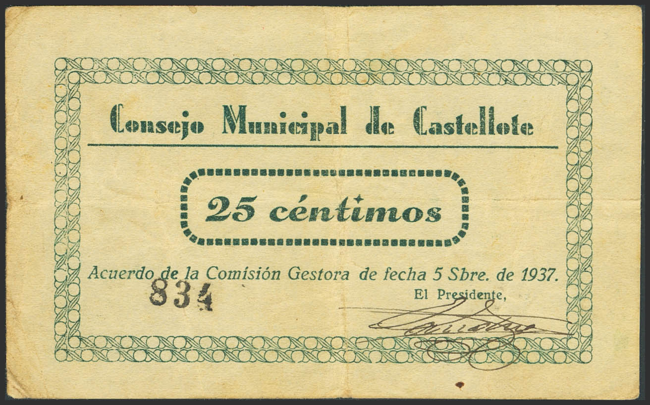 CASTELLOTE (TERUEL). 25 Céntimos. 5 de Septiembre de 1937. Sin serie. (González: 1791). Inusual. MBC.