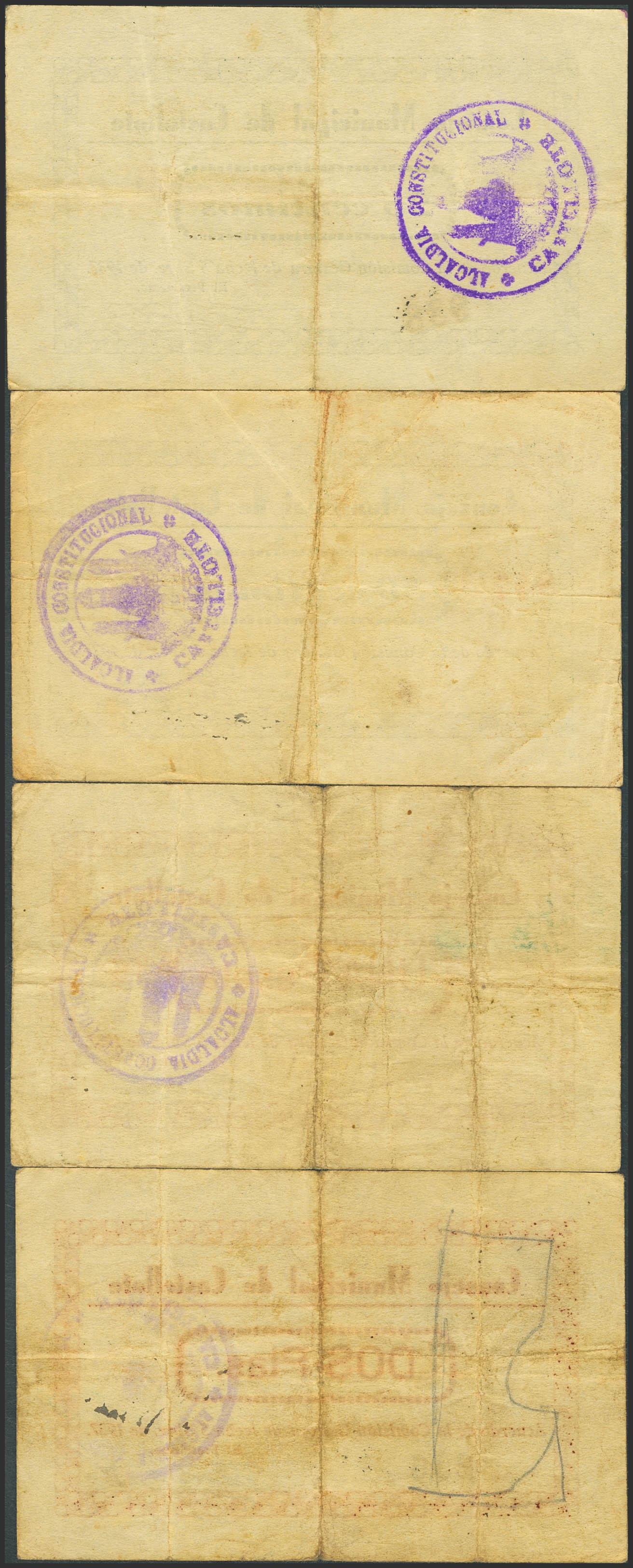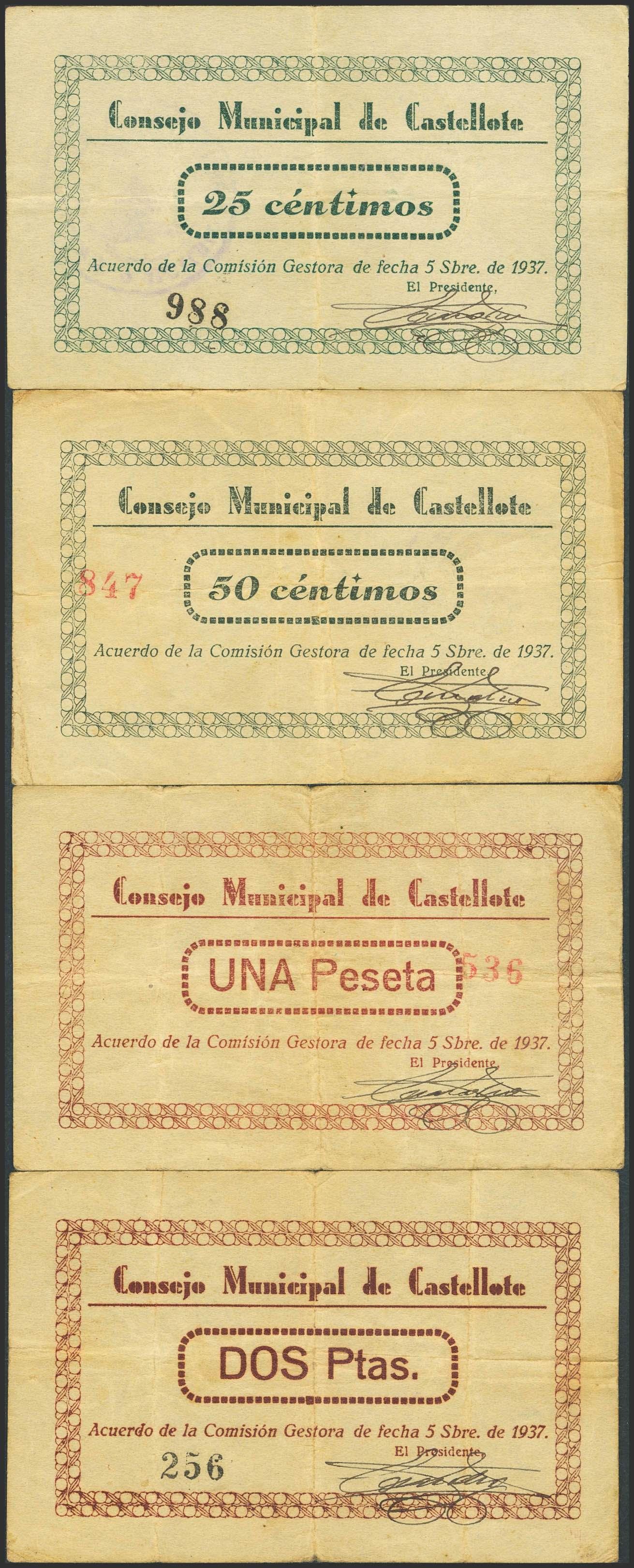 CASTELLOTE (TERUEL). 25 Céntimos, 50 Céntimos, 1 Peseta y 2 Pesetas. 5 de Septiembre de 1937. (González: 1791/94). Inusual serie completa. MBC-.