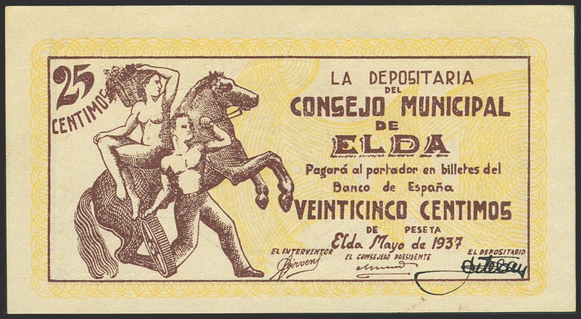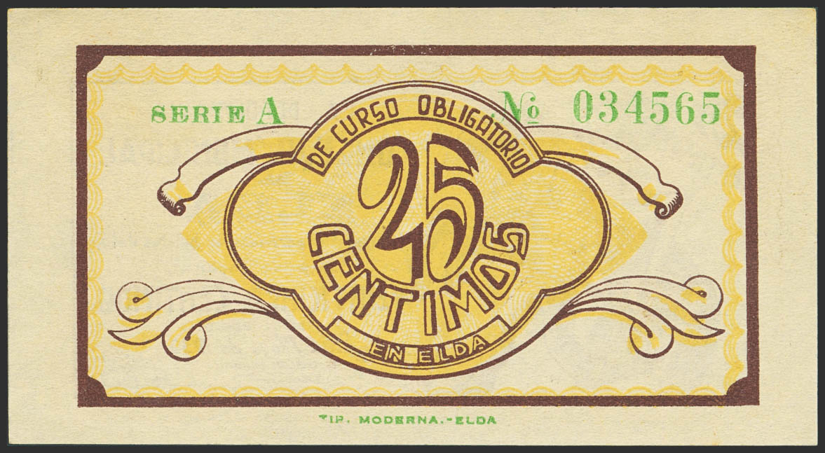 ELDA (ALICANTE). 25 Céntimos. Mayo de 1937. Serie A. (González: 2291). Inusual, especialmente en esta calidad. SC-.