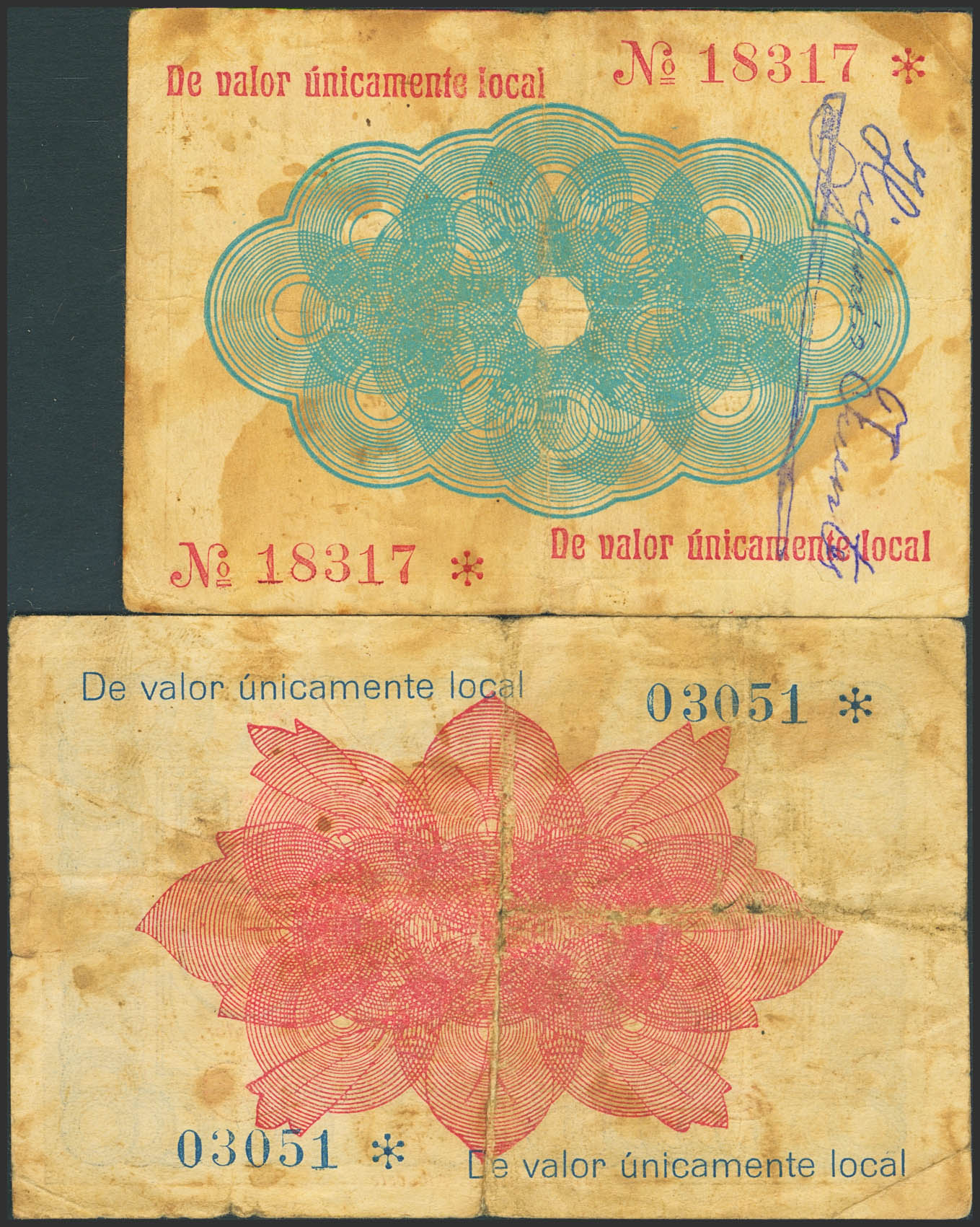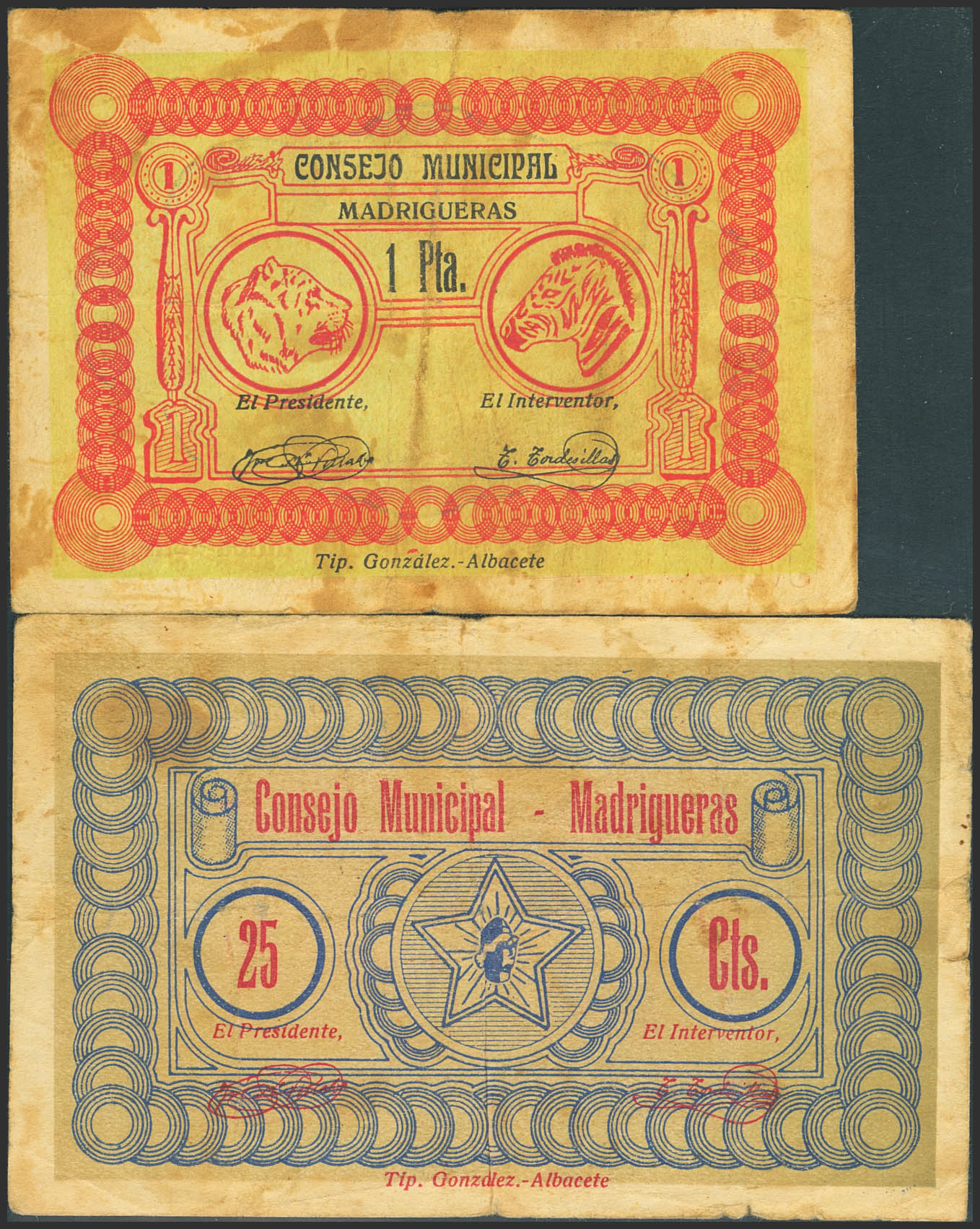 MADRIGUERAS (ALBACETE). 25 Céntimos y 1 Peseta. (1937ca). (González: 3309/10). Rara serie completa. MBC-.
