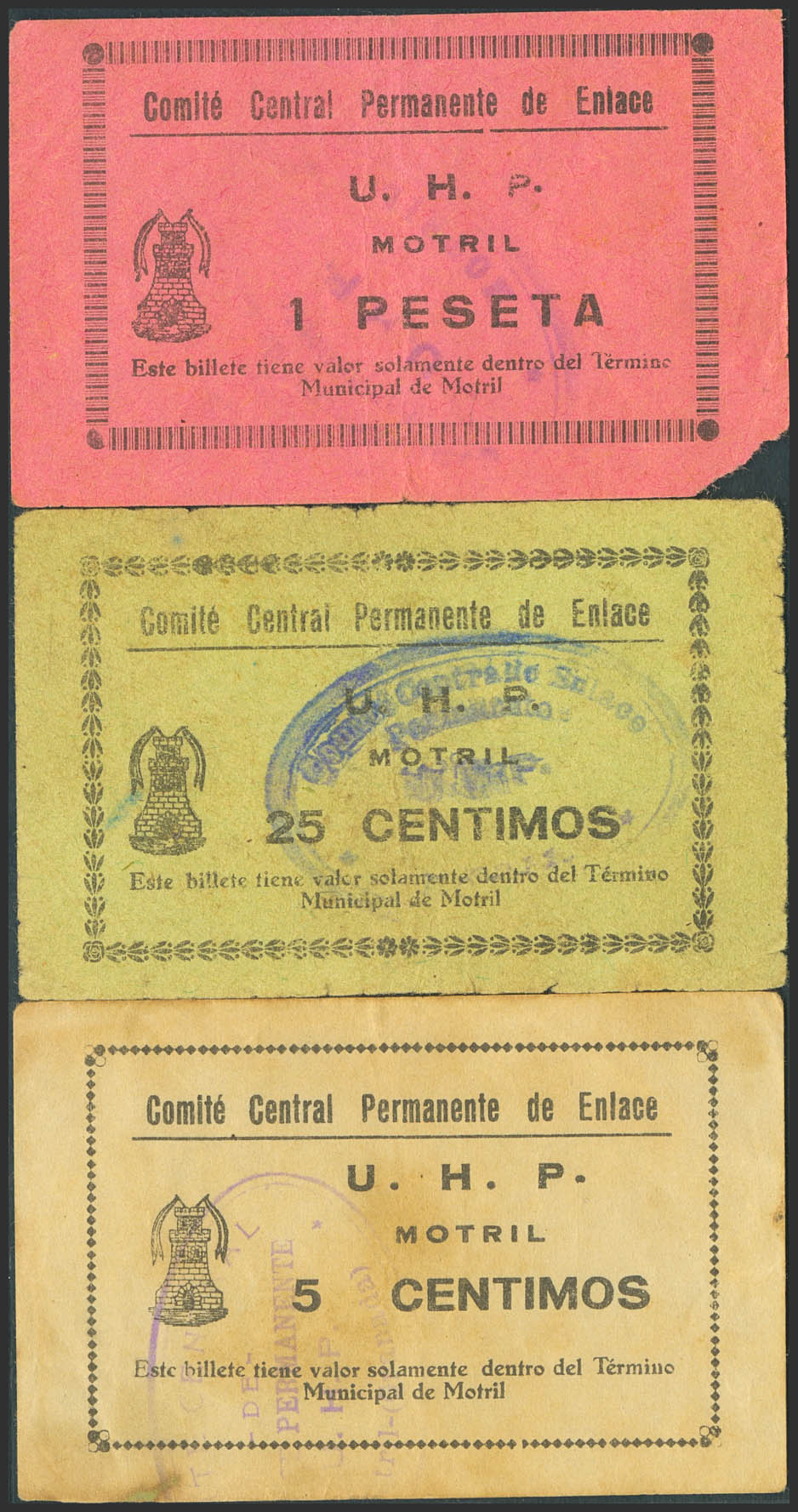 MOTRIL (GRANADA). 5 Céntimos, 25 Céntimos y 1 Peseta. (1937ca). (González: 3742, 3743, 3746). Raros. MBC-/BC+.