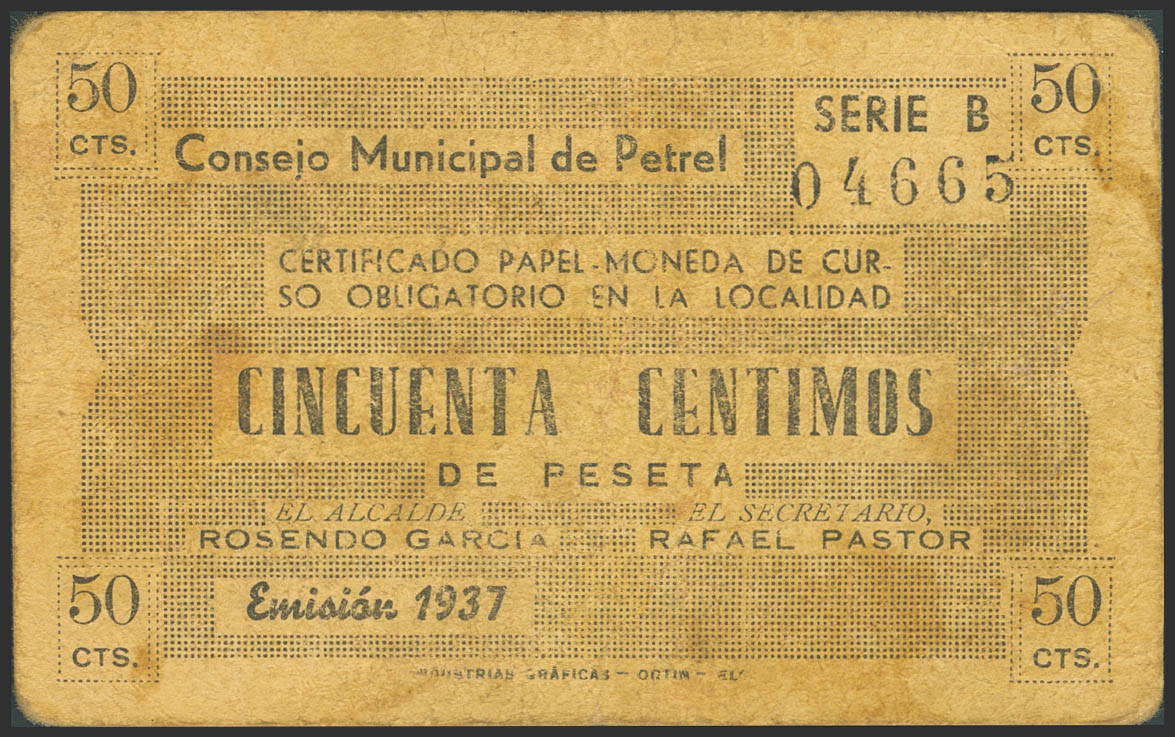 PETREL (ALICANTE). 50 Céntimos. 1937. Serie B. (González: 4158). Raro. MBC-.