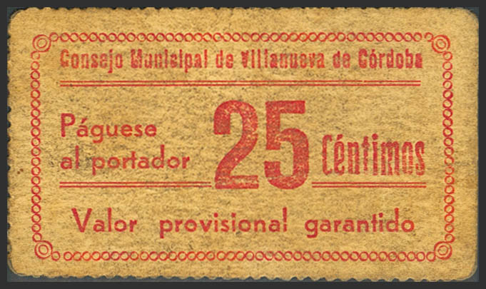 VILLANUEVA DE CORDOBA (CORDOBA). 25 Céntimos. (1937ca). (González: 5634). Inusual. MBC-.