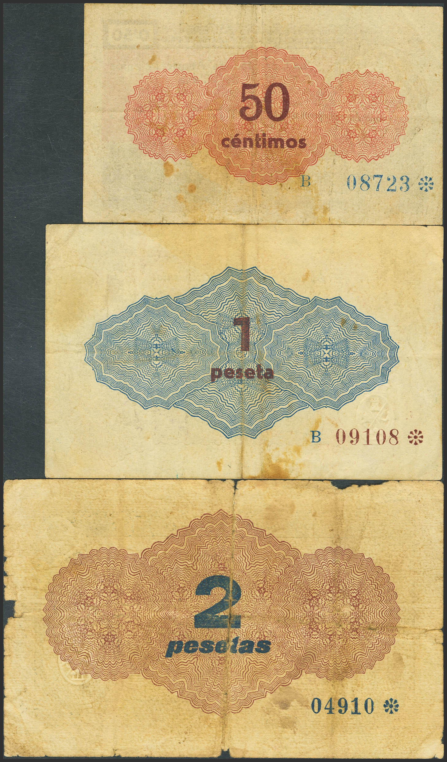 VILLENA (ALICANTE). 50 Céntimos, 1 Peseta y 2 Pesetas. Julio de 1937. (González: 5763/65). Rara serie completa. RC/MBC-.