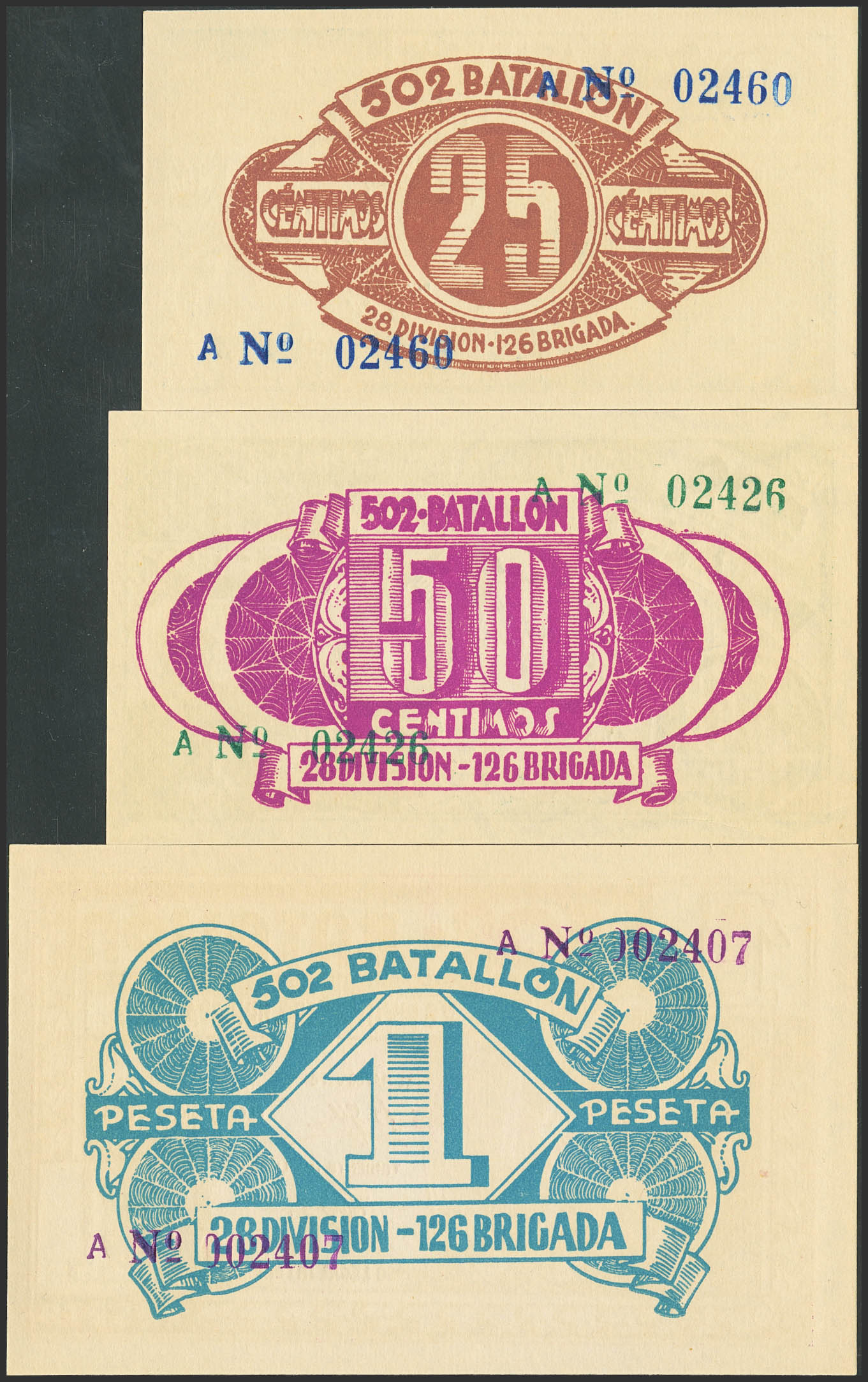 BILLETE MILITAR-502 BATALLON. 25 Céntimos, 50 Céntimos y 1 Peseta. 1937. Serie A, todos. (González: 5876/78). Apresto original. SC-.