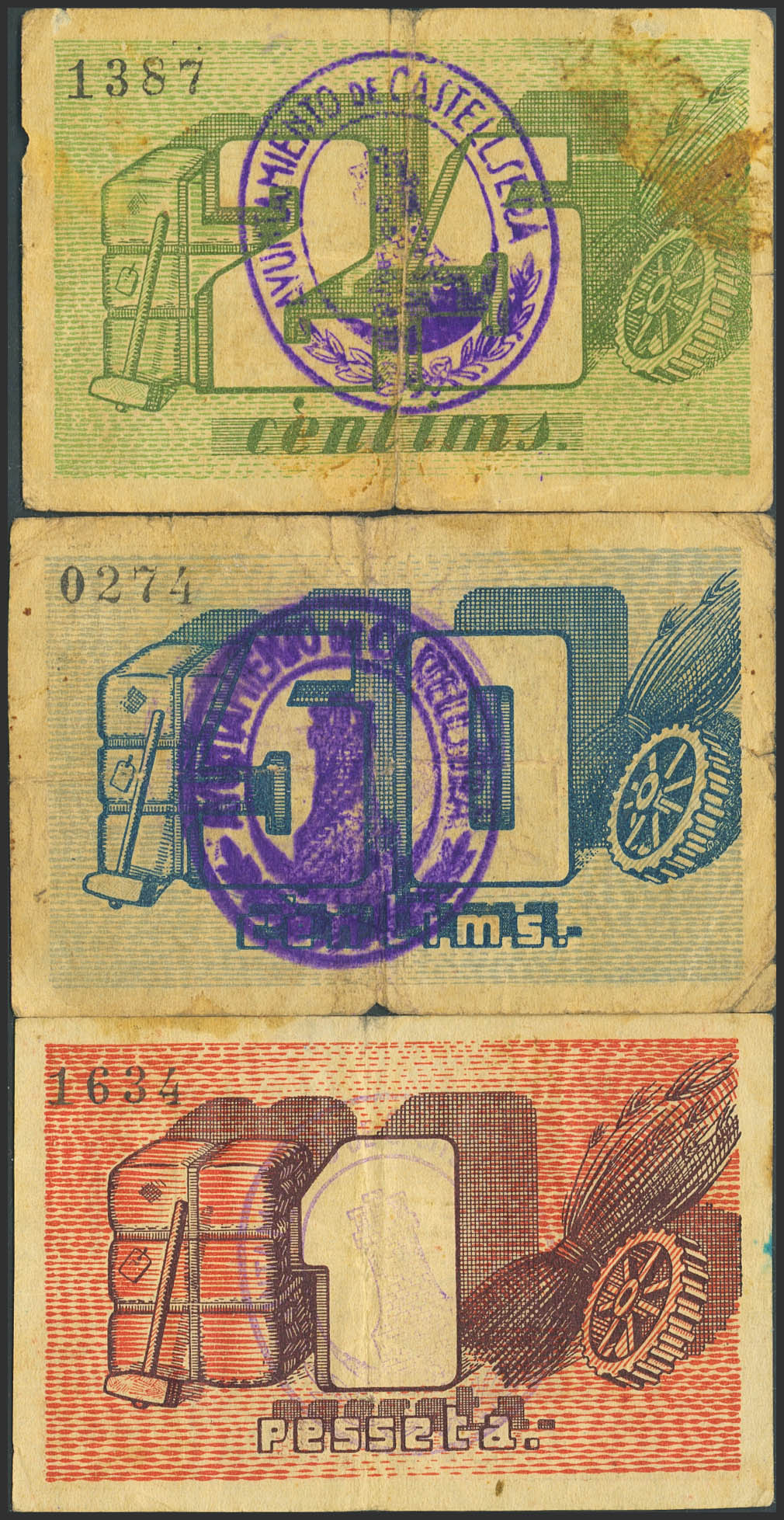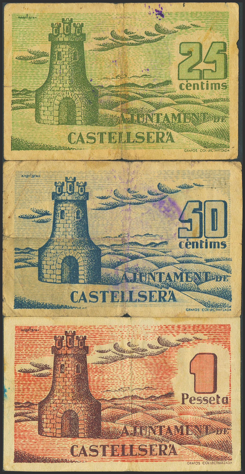 CASTELLSERA (LERIDA). 25 Céntimos, 50 Céntimos y 1 Peseta. (1937ca). (González: 7506/08). Inusual serie completa. BC.