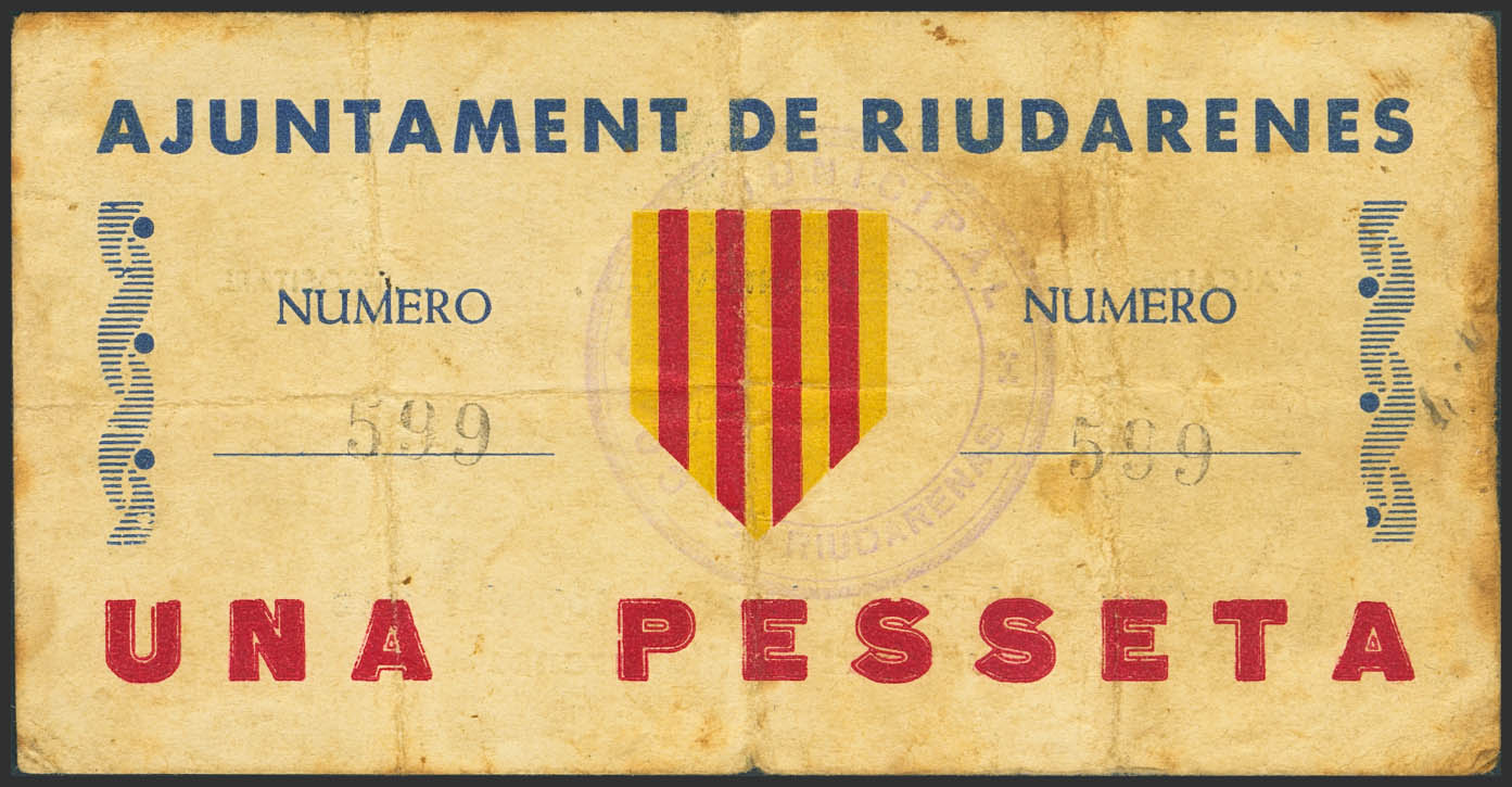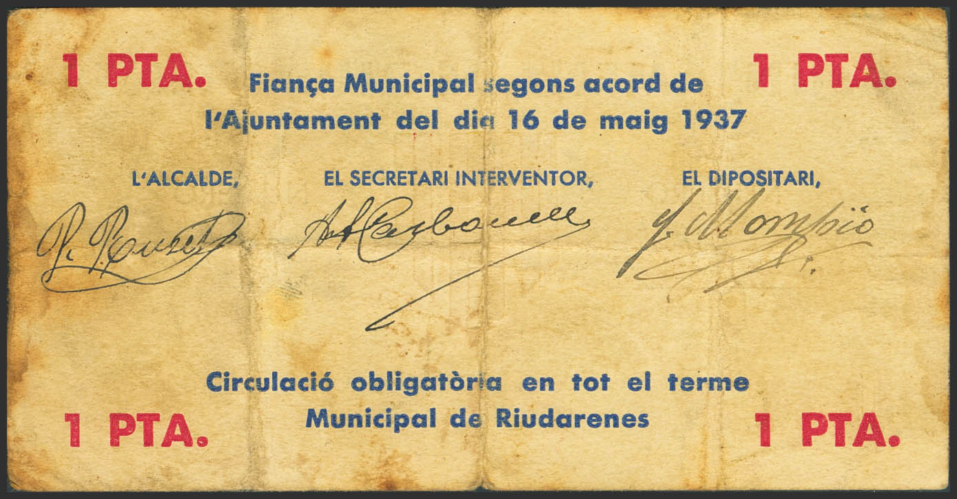 RIUDARENES (GERONA). 1 Peseta. 16 de Mayo de 1937. (González: 9670). Muy raro. MBC.