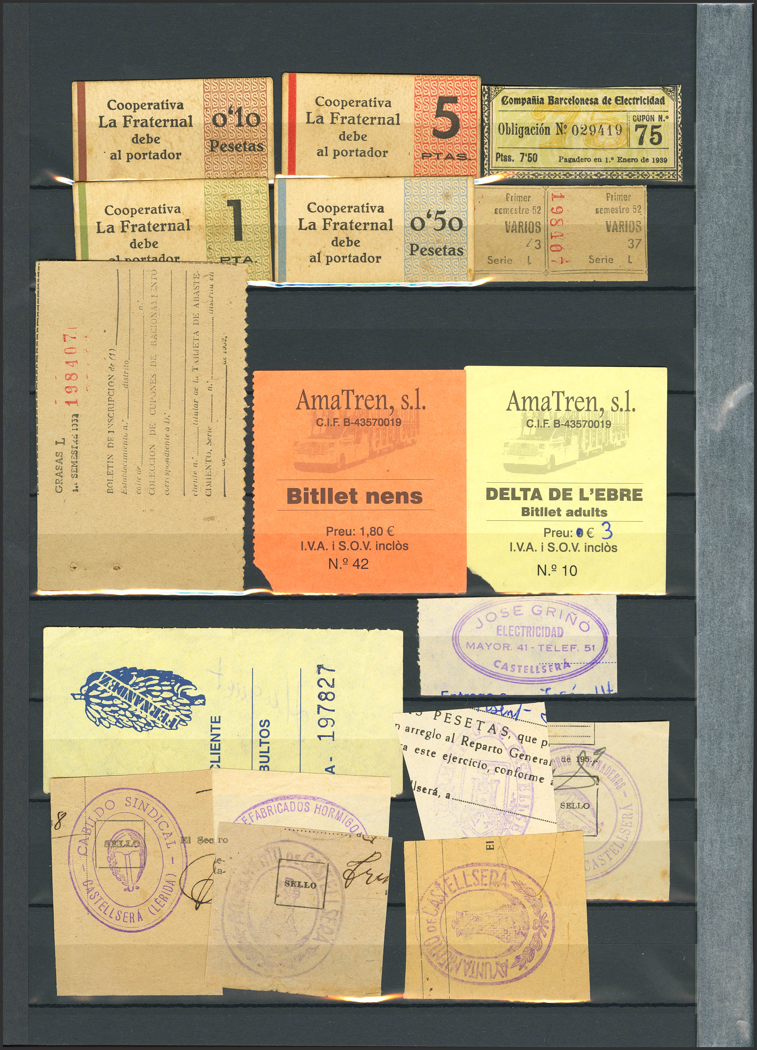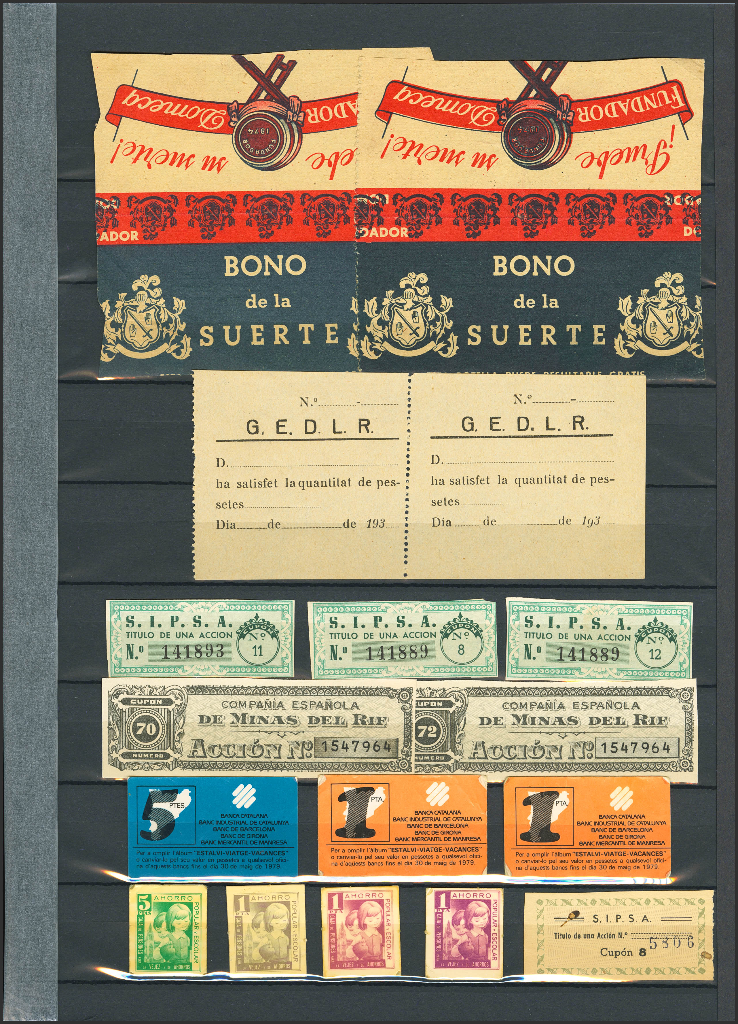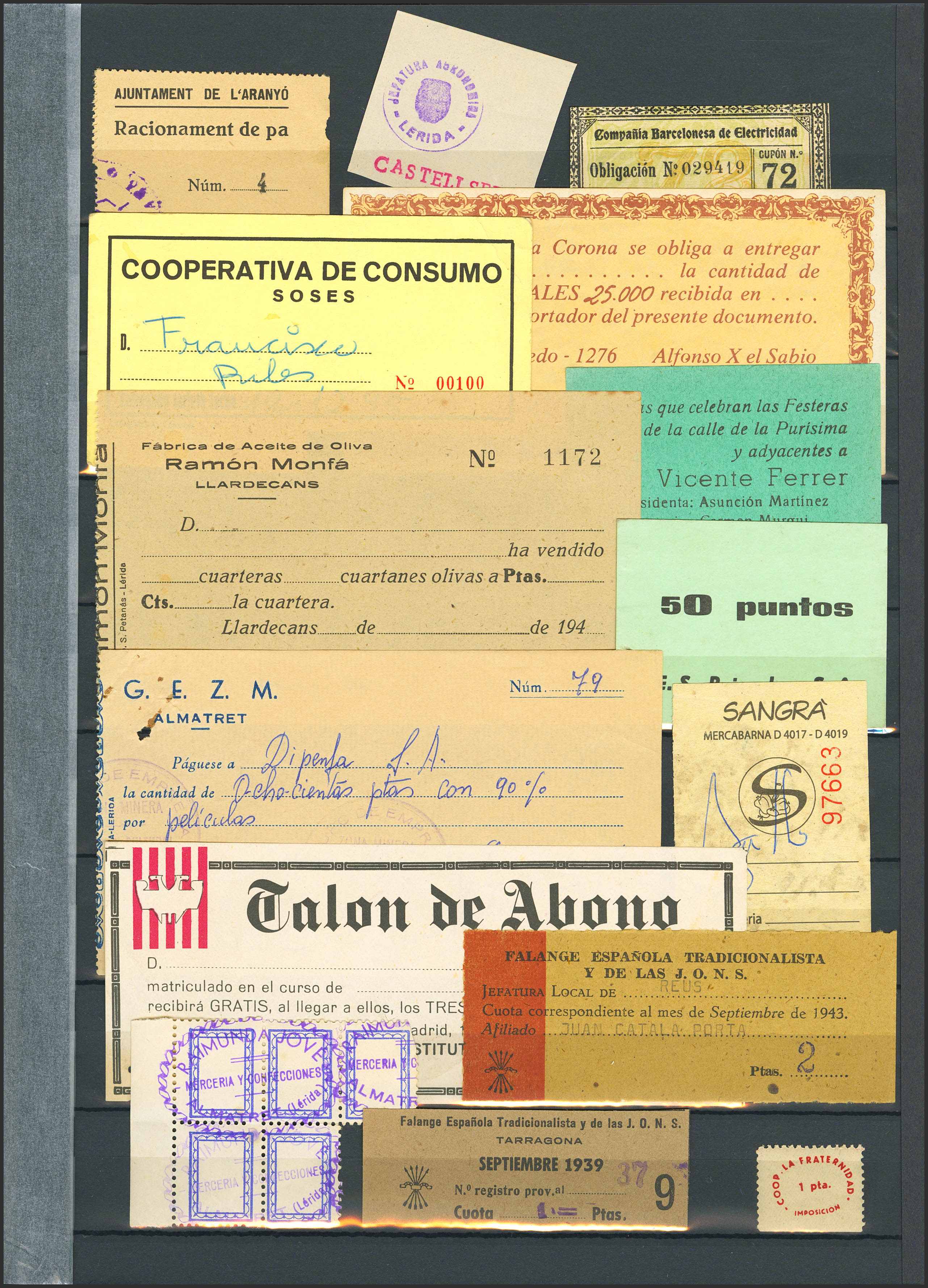 Conjunto de más de 50 talones, bonos y otros pequeños documentos de varias instituciones y en diversas calidades. A EXAMINAR.