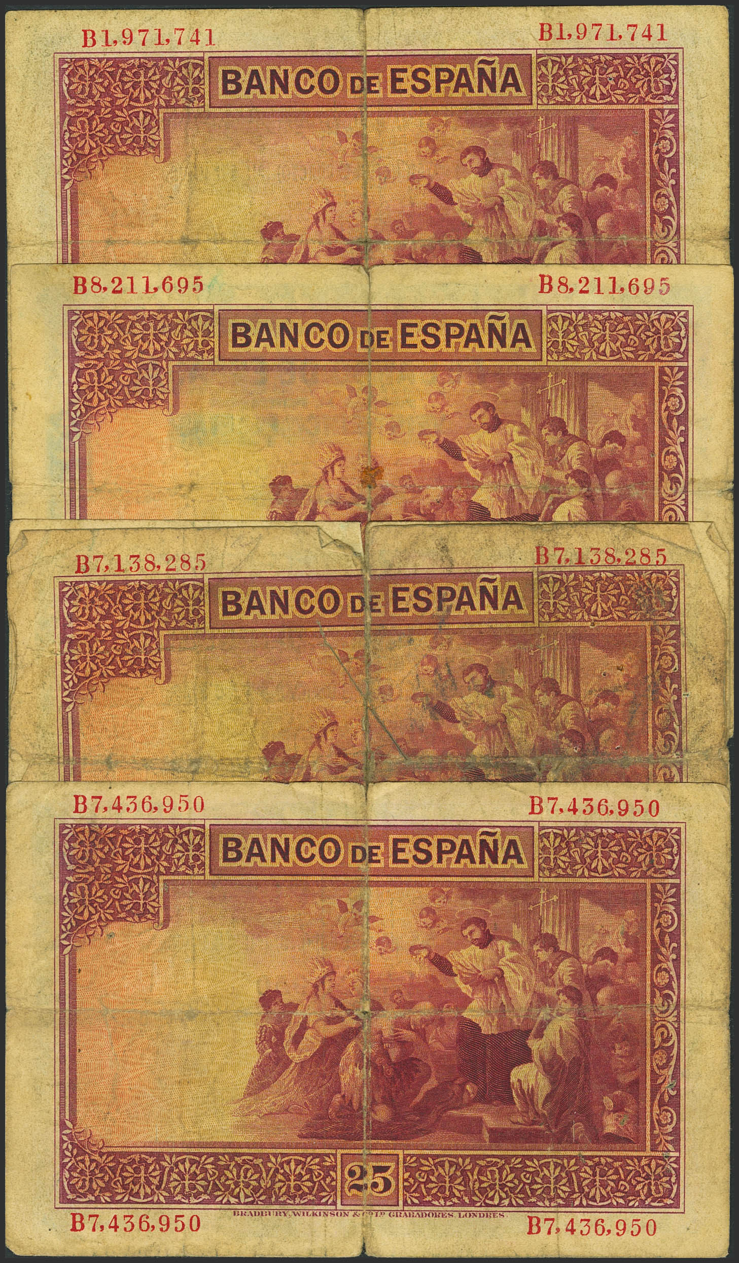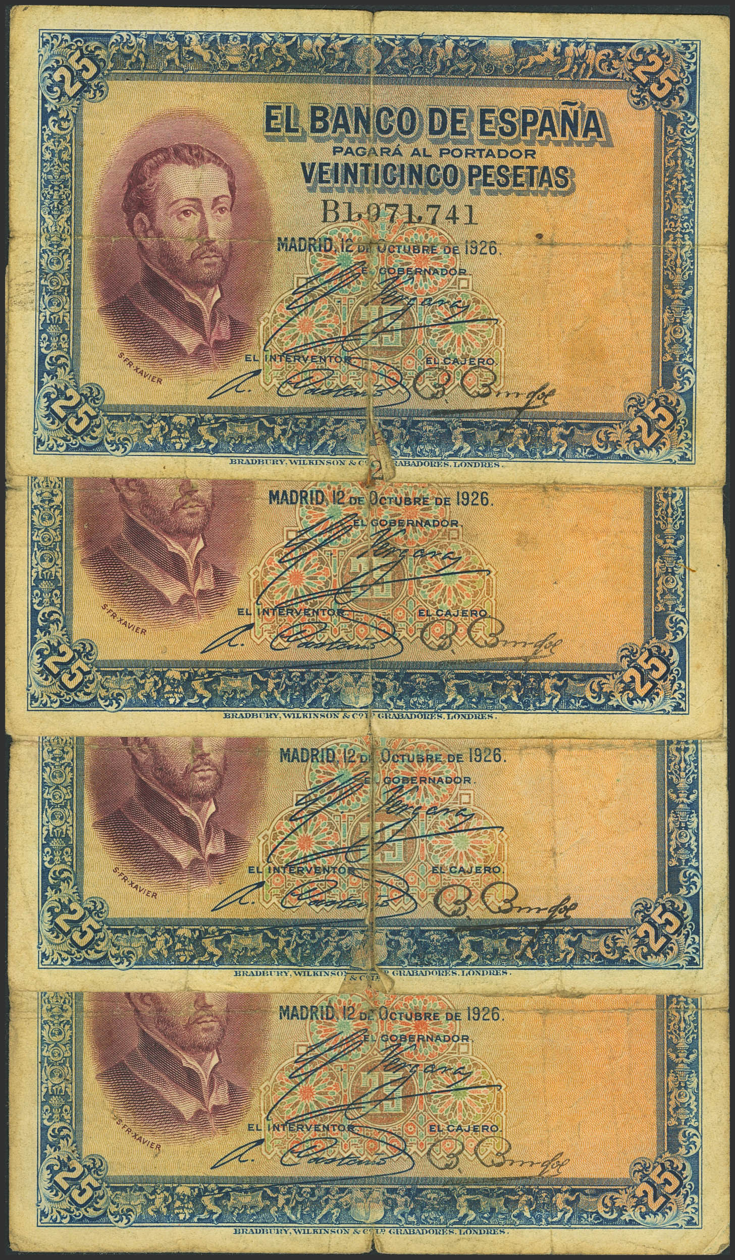 Conjunto de 5 billetes de 25 Pesetas, emitidos el 12 de Octubre de 1926, con diferentes series, (Edifil 2023: 325a), diferentes estados de conservación. A EXAMINAR.