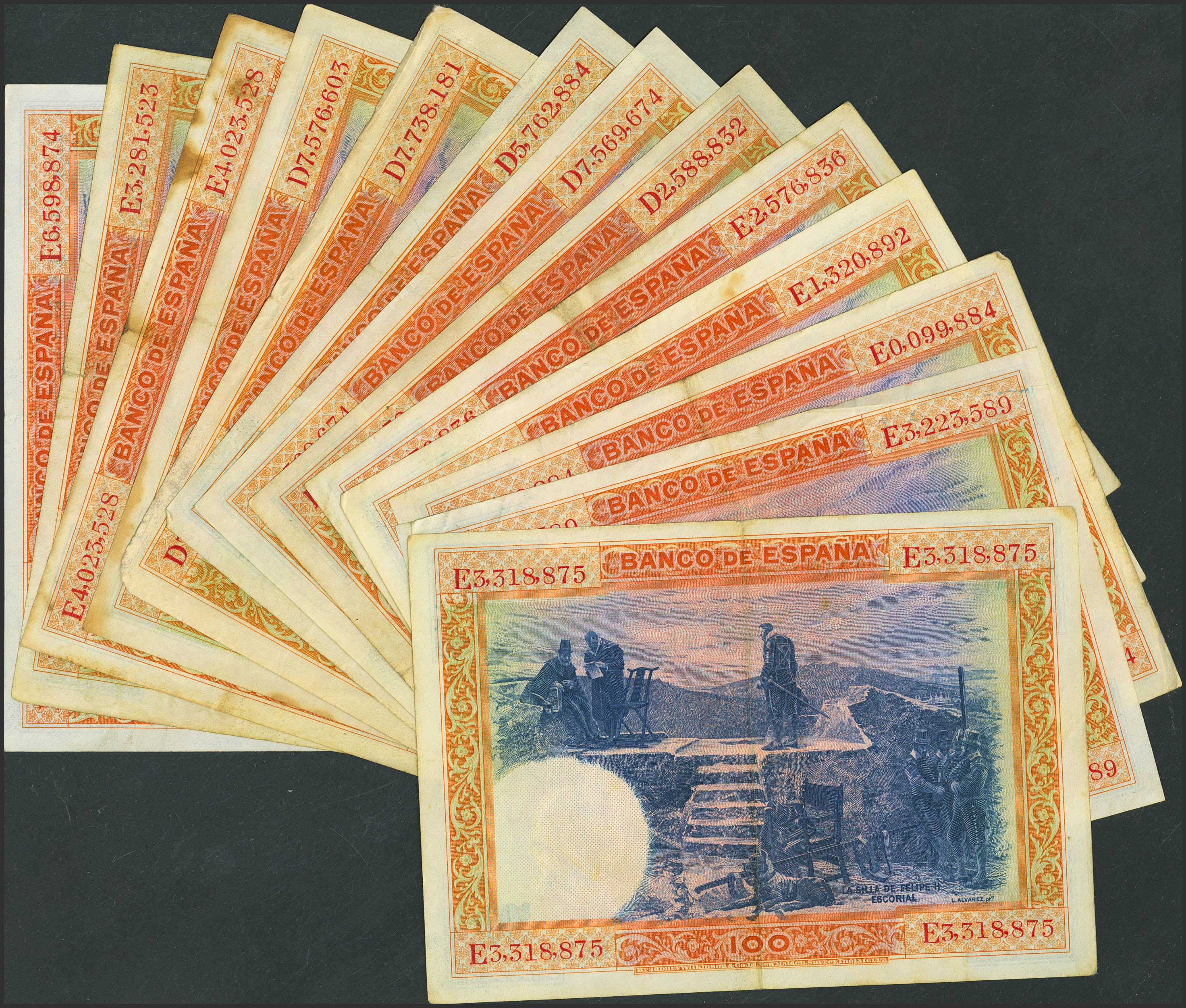 Conjunto de 13 billetes de 100 Pesetas, emitidos el 1 de Julio de 1925, con diferentes series, (Edifil 2023: 350), diferentes estados de conservación. A EXAMINAR.