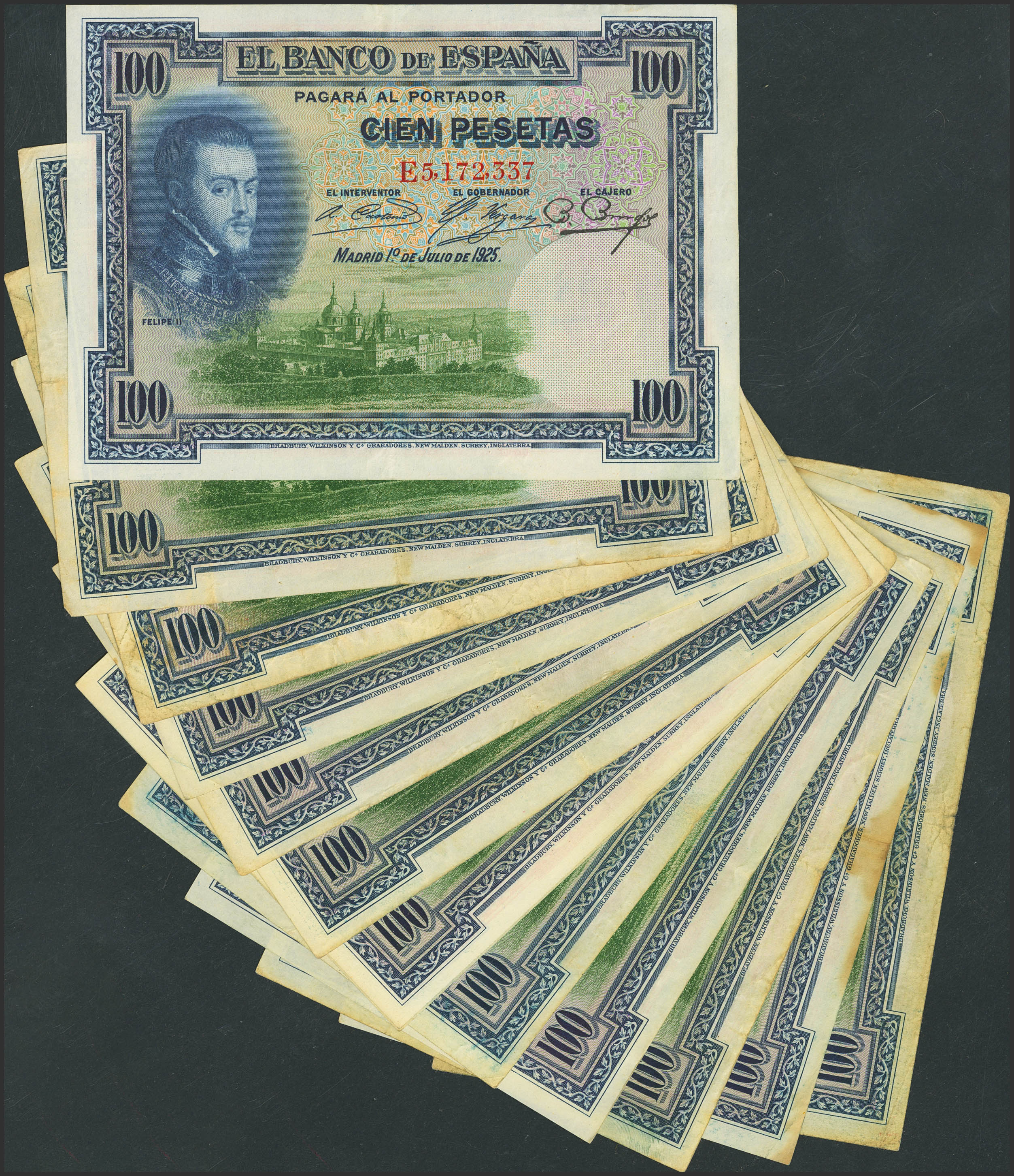 Conjunto de 13 billetes de 100 Pesetas, emitidos el 1 de Julio de 1925, con diferentes series, (Edifil 2023: 350), diferentes estados de conservación. A EXAMINAR.