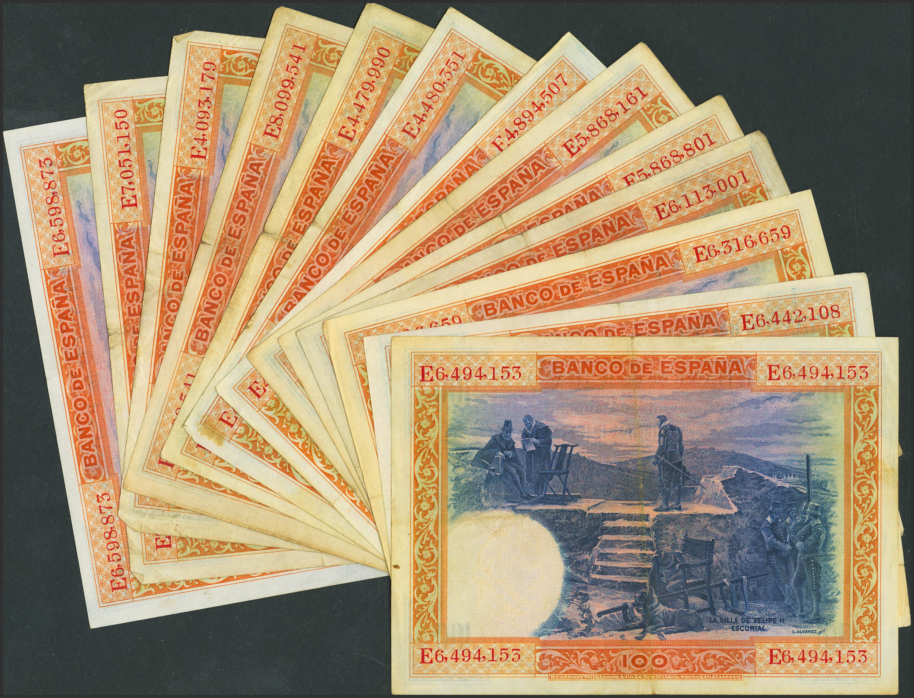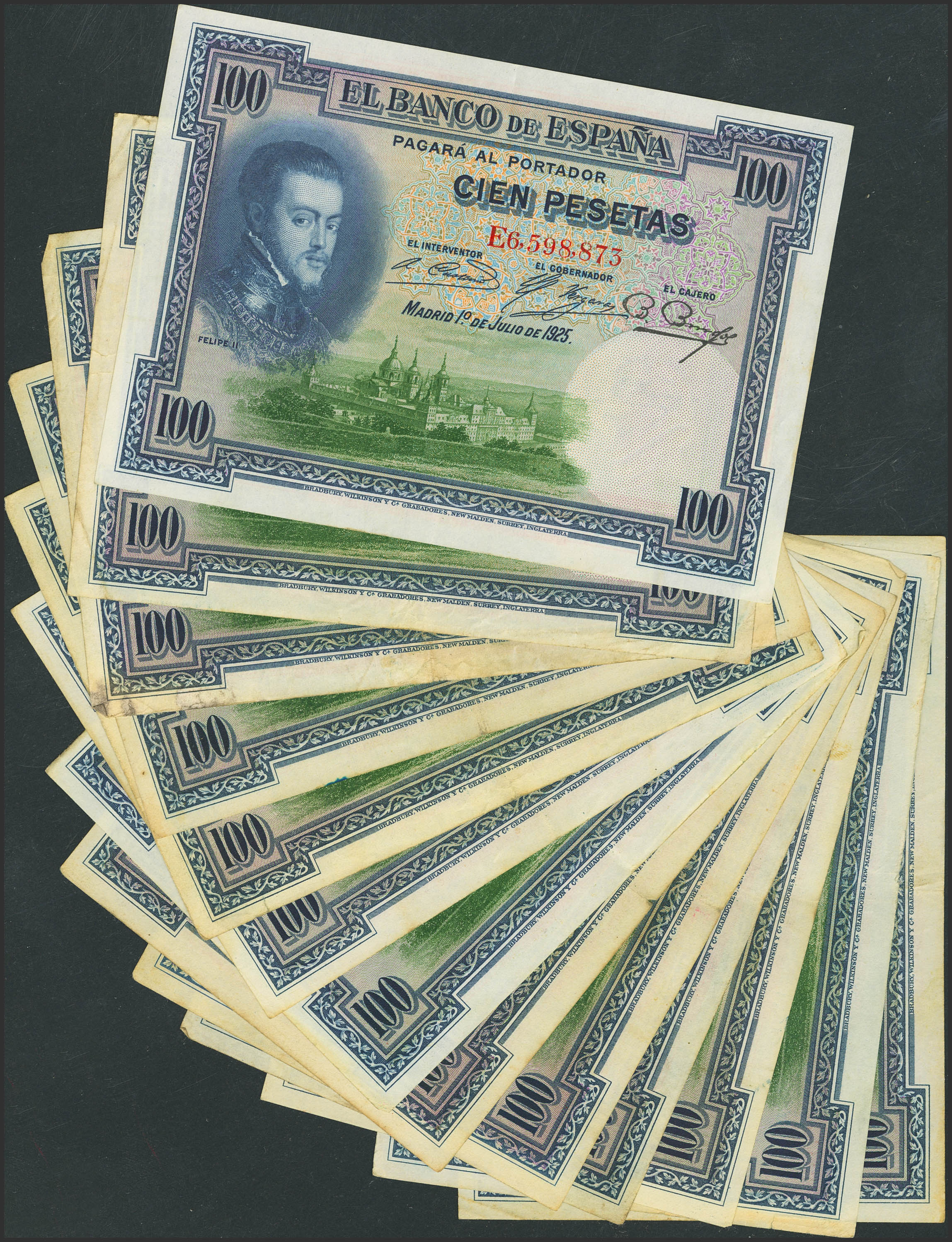 Conjunto de 13 billetes de 100 Pesetas, emitidos el 1 de Julio de 1925, con diferentes series, (Edifil 2023: 350), diferentes estados de conservación. A EXAMINAR.