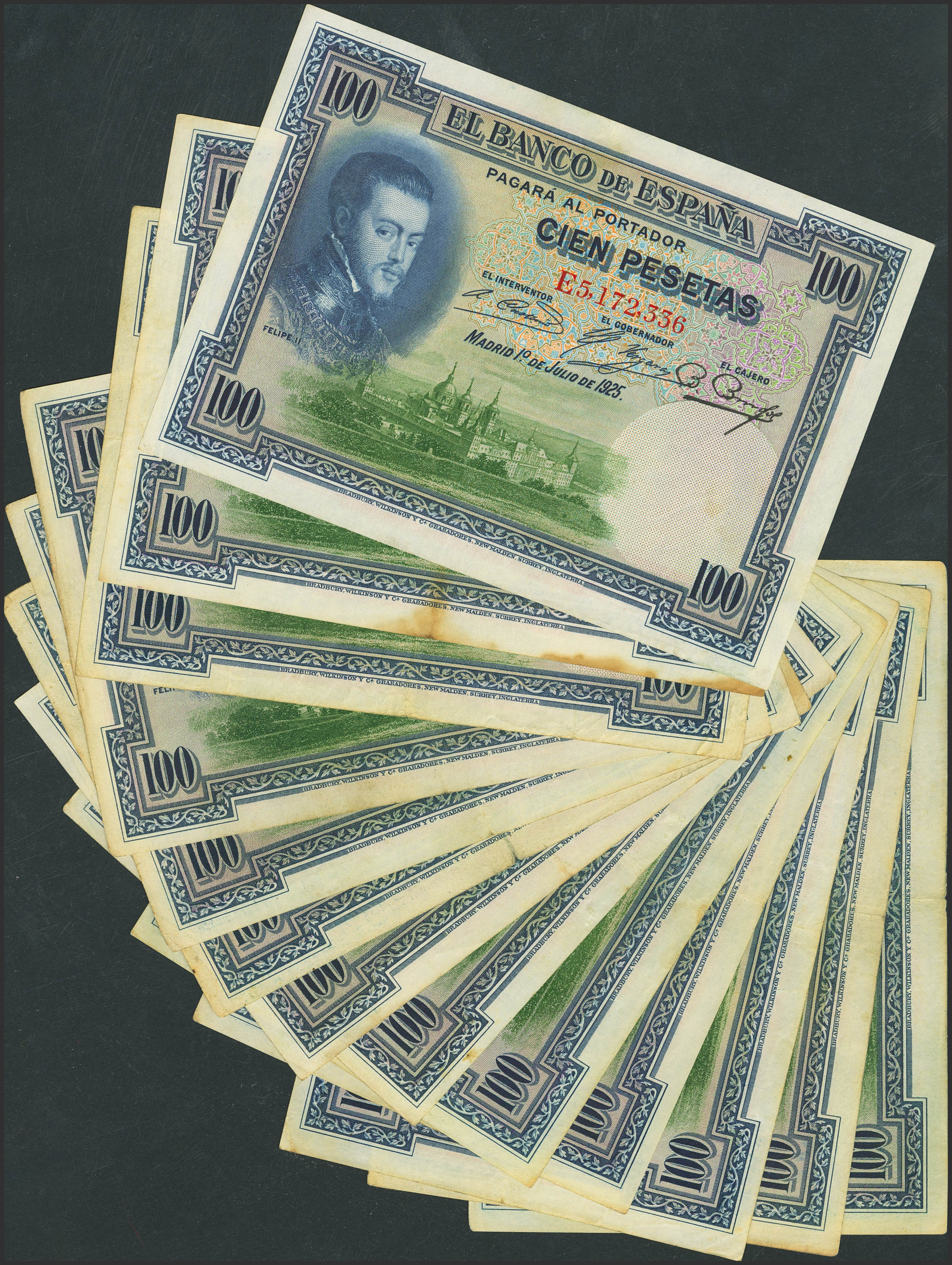 Conjunto de 13 billetes de 100 Pesetas, emitidos el 1 de Julio de 1925, con diferentes series, (Edifil 2023: 350), diferentes estados de conservación. A EXAMINAR.