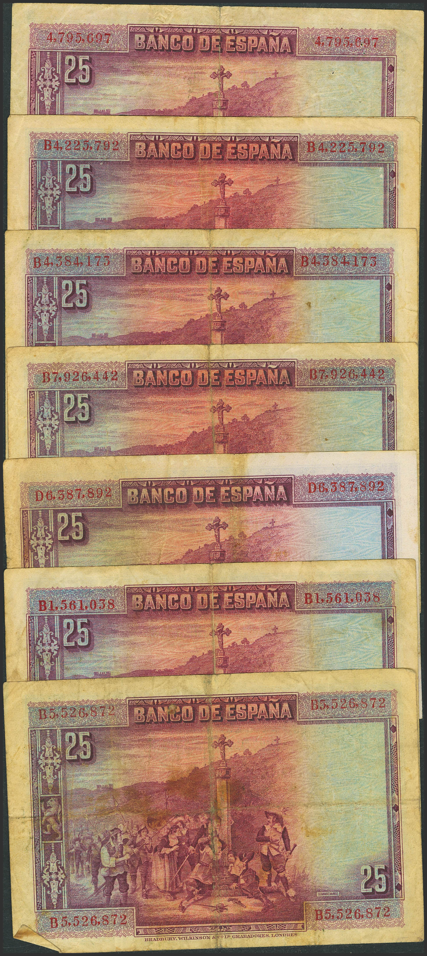 Conjunto de 8 billetes de 25 Pesetas, emitidos el 15 de Agosto de 1928, con diferentes series, (Edifil 2023: 353), diferentes estados de conservación. A EXAMINAR.