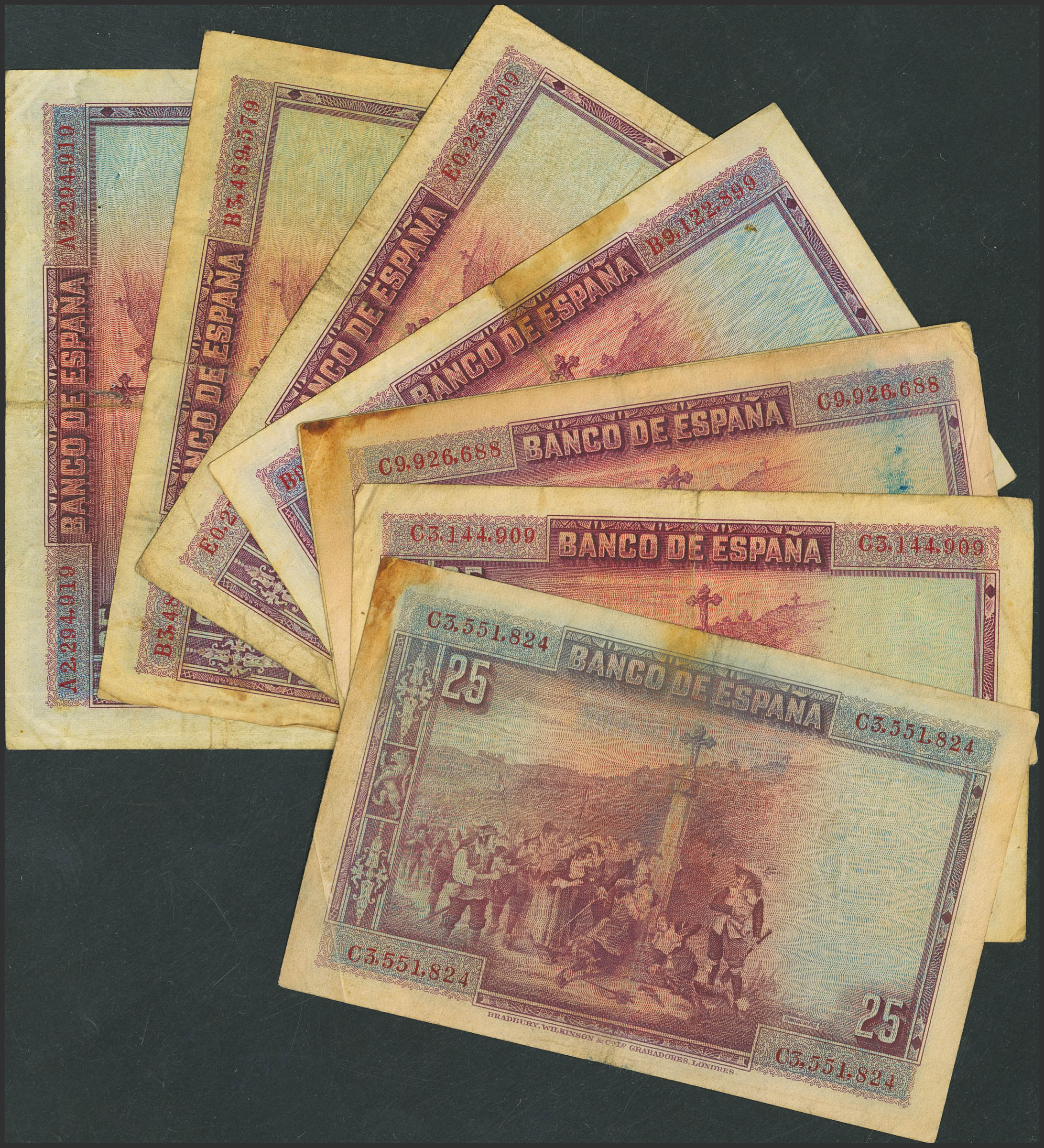 Conjunto de 8 billetes de 25 Pesetas, emitidos el 15 de Agosto de 1928, con diferentes series, (Edifil 2023: 353), diferentes estados de conservación. A EXAMINAR.