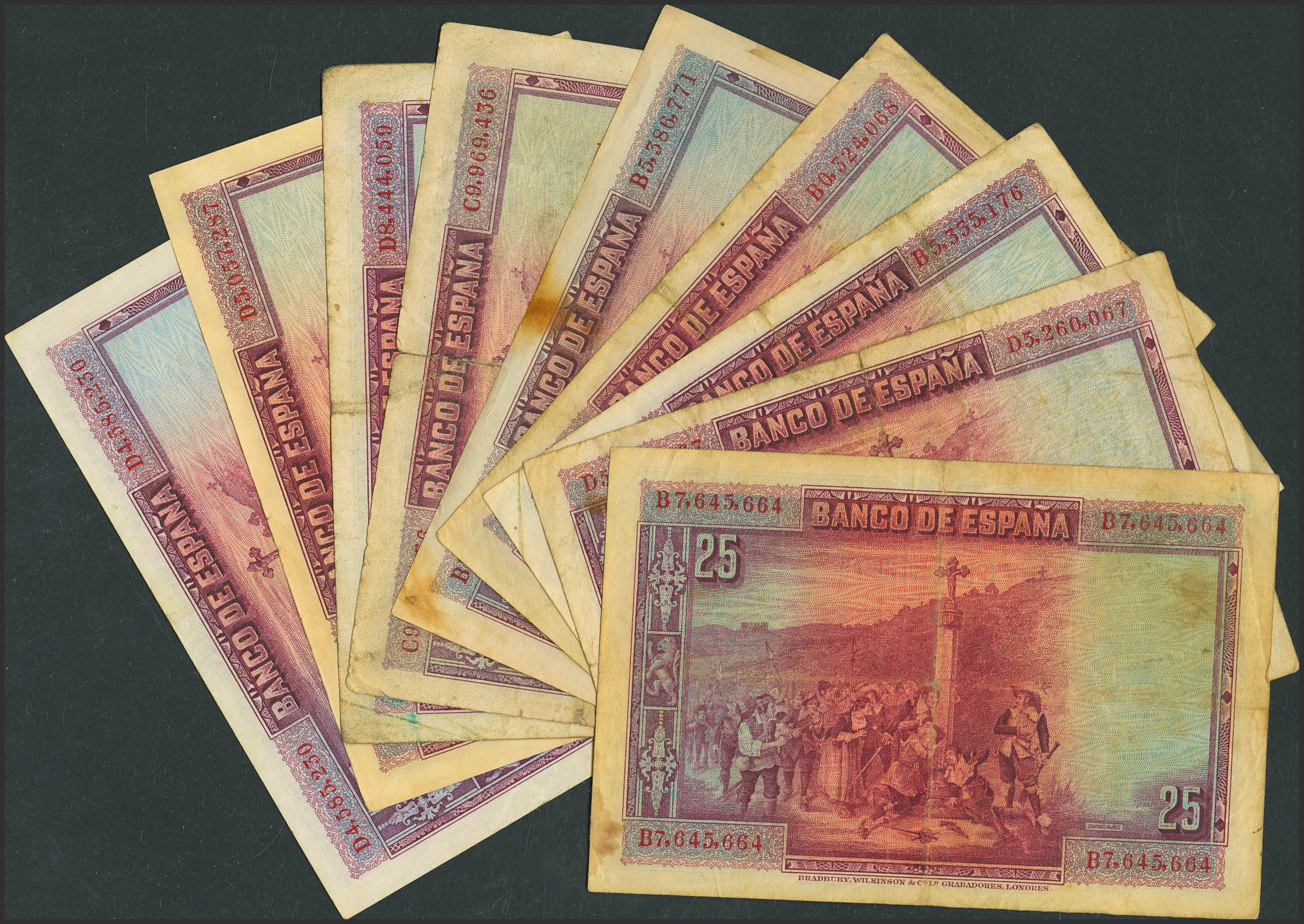 Conjunto de 8 billetes de 25 Pesetas, emitidos el 15 de Agosto de 1928, con diferentes series, (Edifil 2023: 353), diferentes estados de conservación. A EXAMINAR.