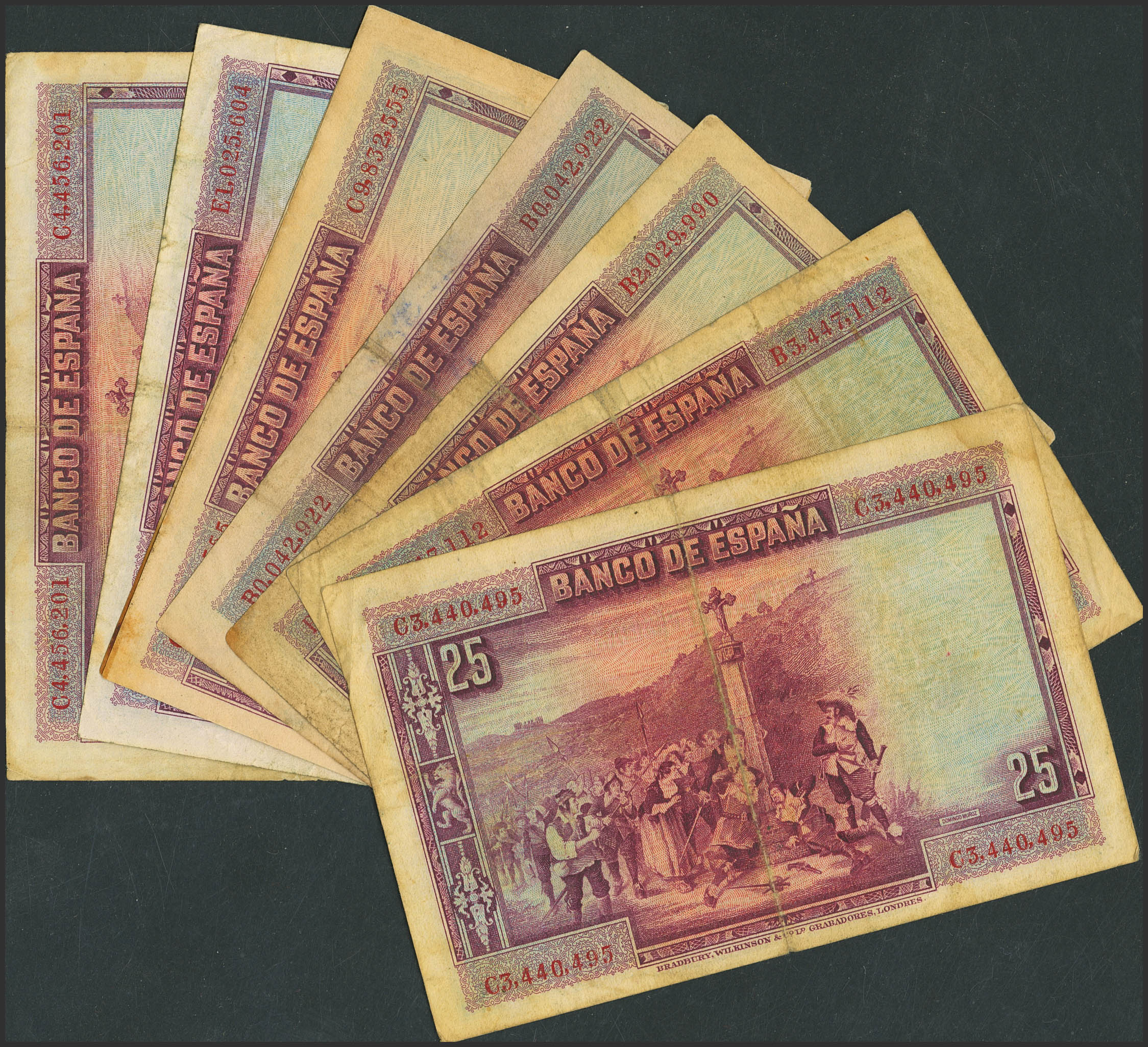Conjunto de 8 billetes de 25 Pesetas, emitidos el 15 de Agosto de 1928, con diferentes series, (Edifil 2023: 353), diferentes estados de conservación. A EXAMINAR.