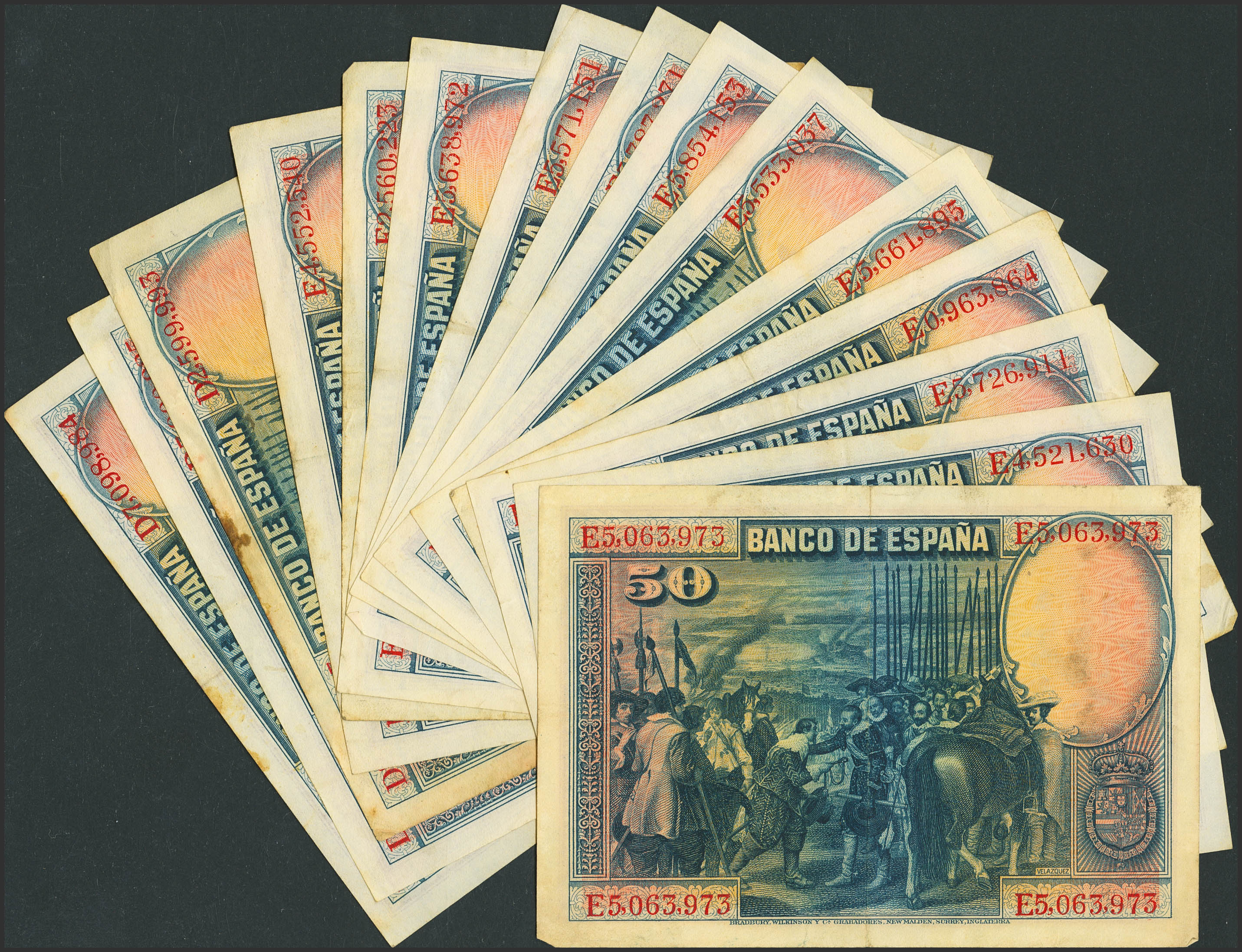 Conjunto de 15 billetes de 50 Pesetas, emitidos el 15 de Agosto de 1928, con diferentes series. (Edifil 2023: 354). Diversos estados de conservación. A EXAMINAR