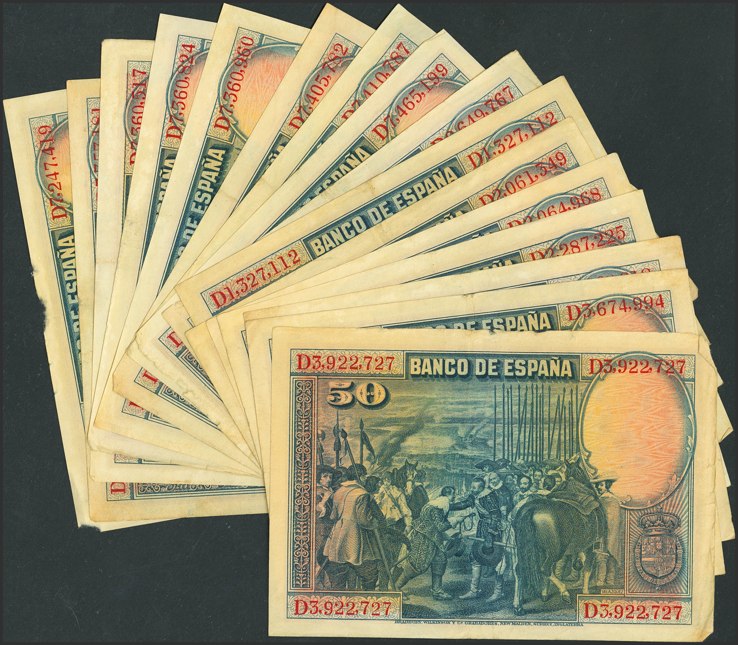 Conjunto de 15 billetes de 50 Pesetas, emitidos el 15 de Agosto de 1928, con diferentes series. (Edifil 2023: 354). Diversos estados de conservación. A EXAMINAR