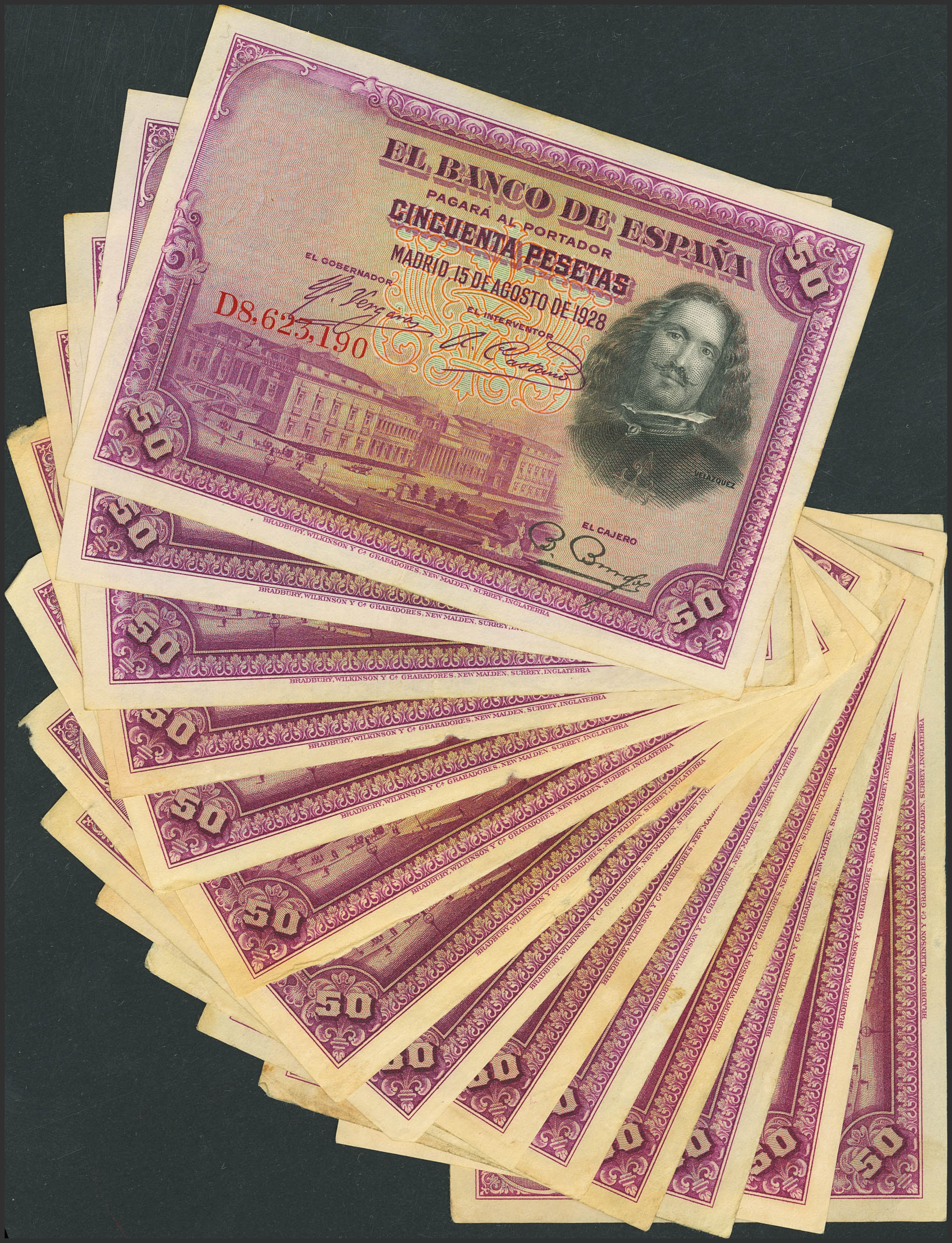 Conjunto de 15 billetes de 50 Pesetas, emitidos el 15 de Agosto de 1928, con diferentes series. (Edifil 2023: 354). Diversos estados de conservación. A EXAMINAR