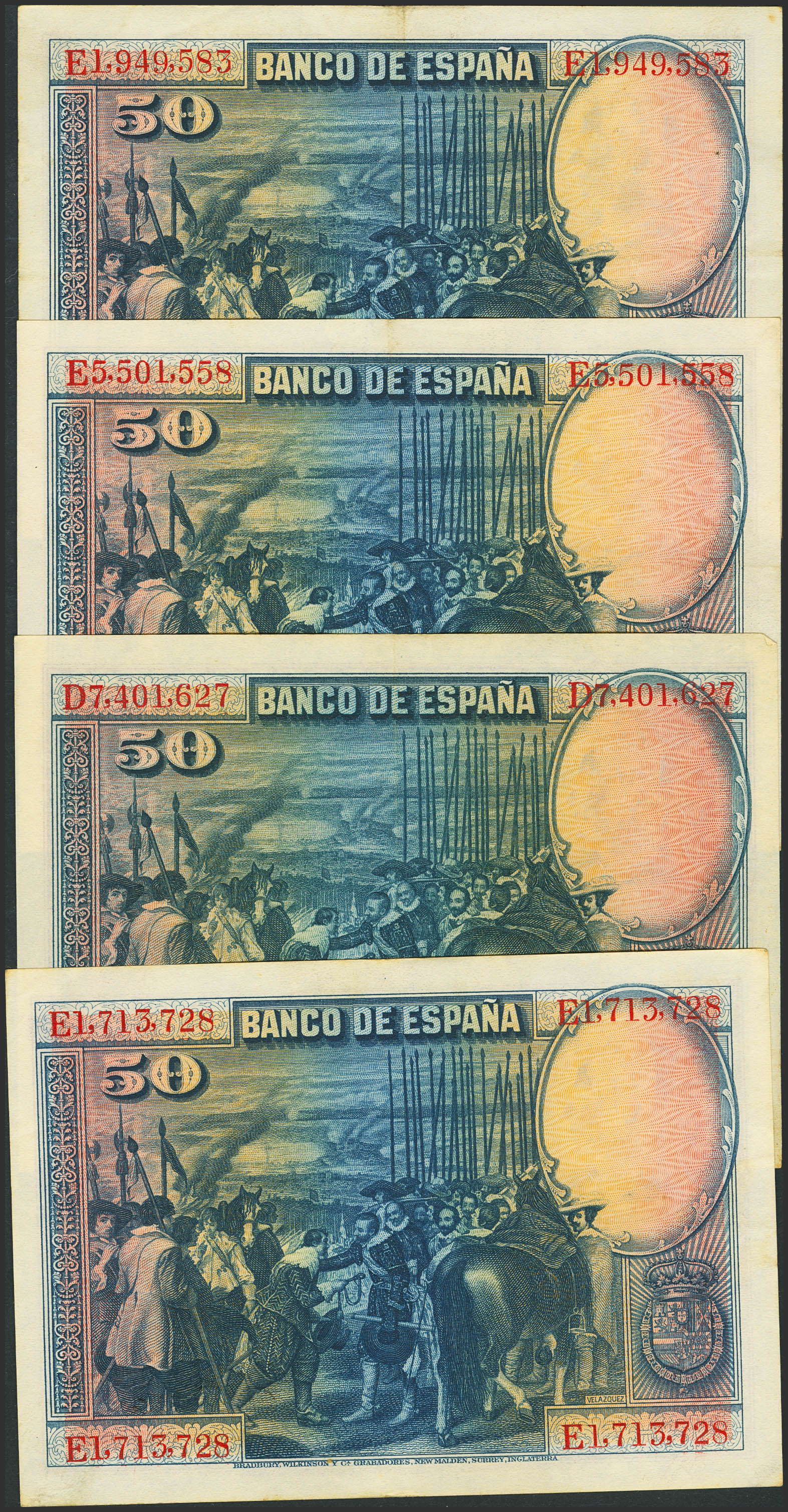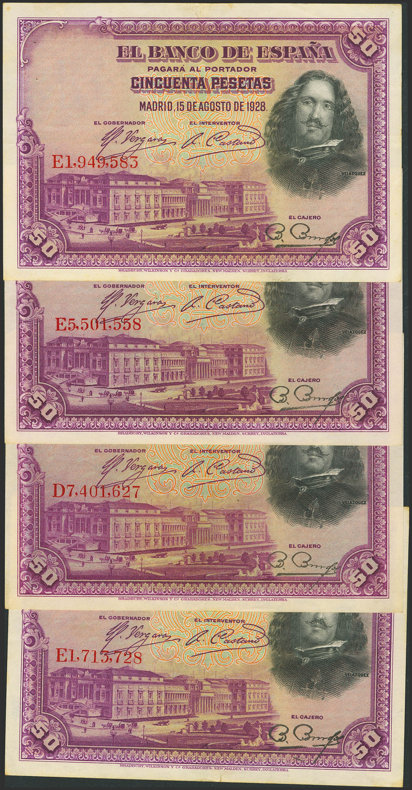 Conjunto de 4 billetes de 50 Pesetas, emitidos el 15 de Agosto de 1928, con diferentes series. (Edifil 2023: 354). Diversos estados de conservación. A EXAMINAR