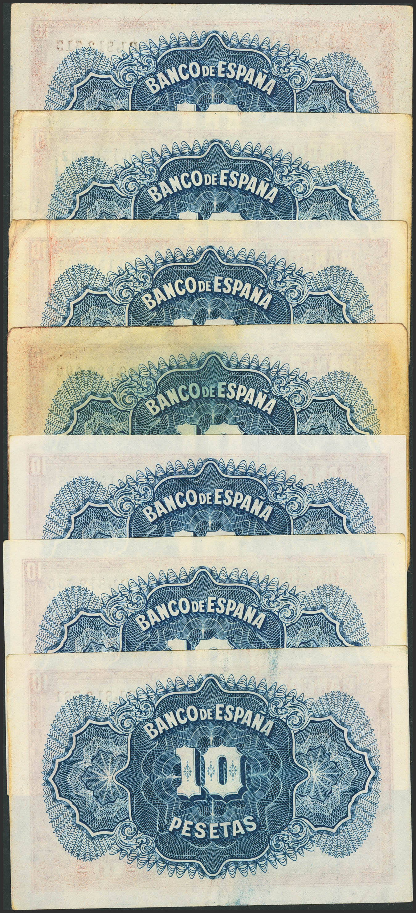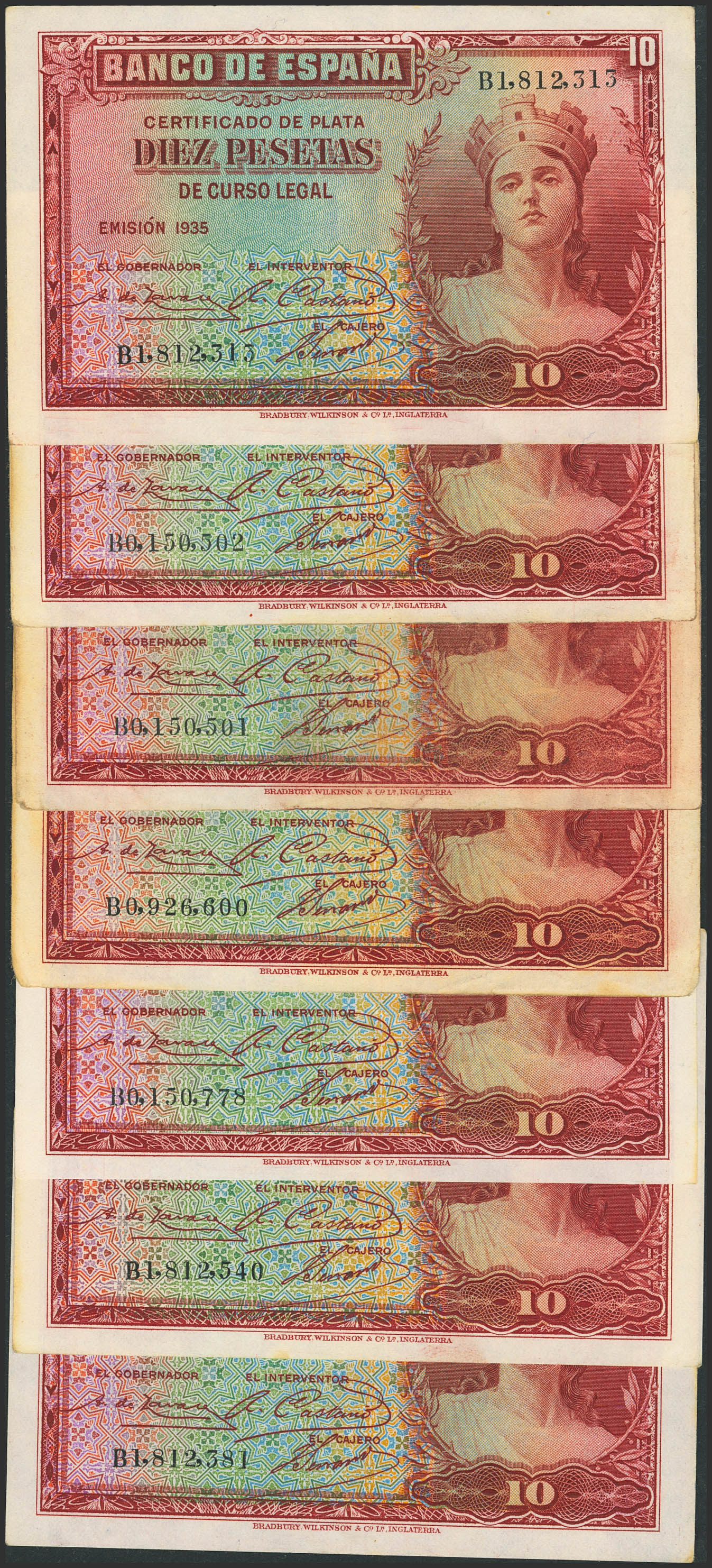 Conjunto de 7 billetes de 10 Pesetas, Certificado de Plata, emitidos en 1935, con diferentes series, (Edifil 2023: 364a), diferentes estados de conservación. A EXAMINAR.