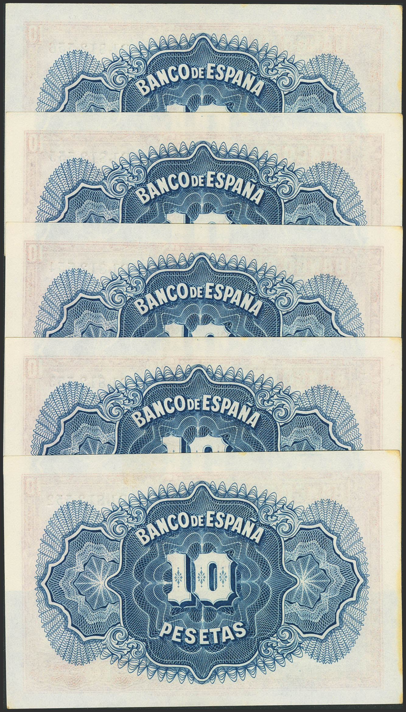Conjunto de 5 billetes correlativos de 10 Pesetas, Certificado de Plata, emitidos en 1935, todos ellos con la serie B (Edifil 2023: 364a), sin circular y con manchitas del tiempo. A EXAMINAR.
