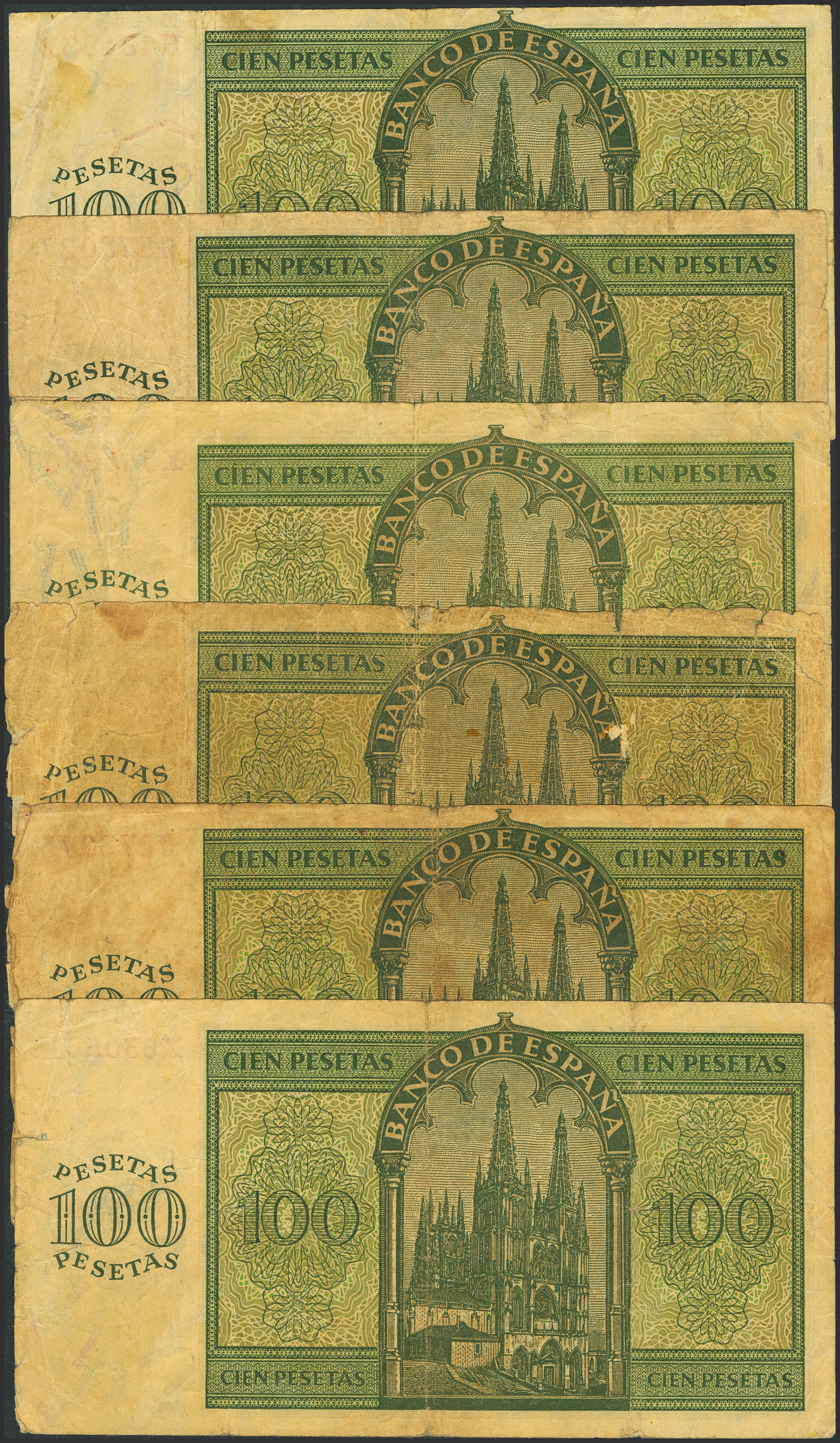 Conjunto de 6 billetes de 100 Pesetas, emitidos el 21 de Noviembre de 1936, con diferentes series, (Edifil 2023: 421a), diferentes estados de conservación. A EXAMINAR.