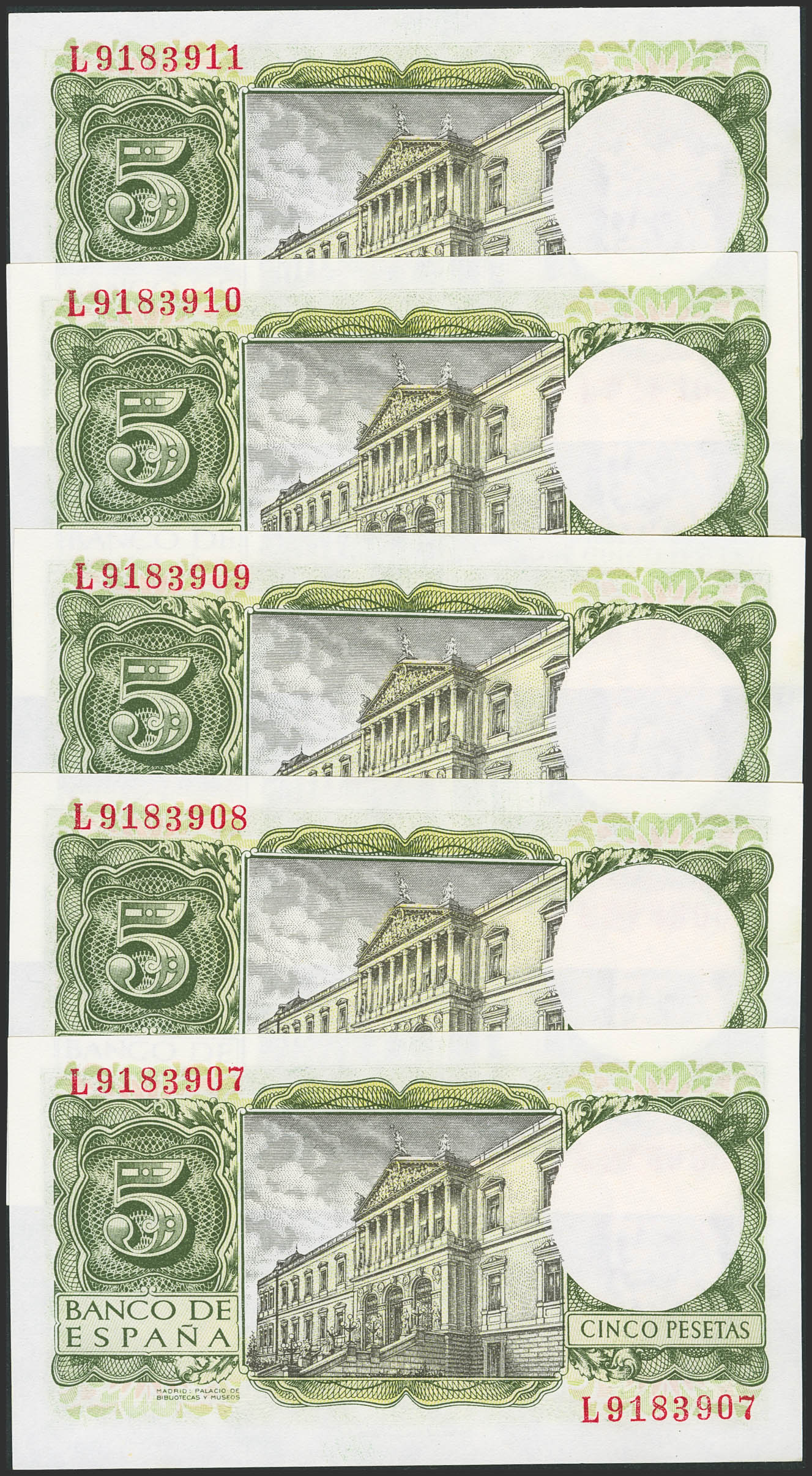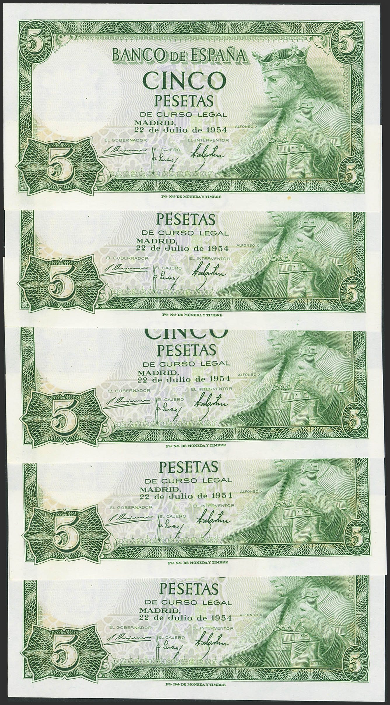 Conjunto de 5 billetes correlativos de 5 Pesetas, emitidos el 22 de Julio de 1954, todos ellos con la serie L (Edifil 2023: 466a), apresto original. SC.
