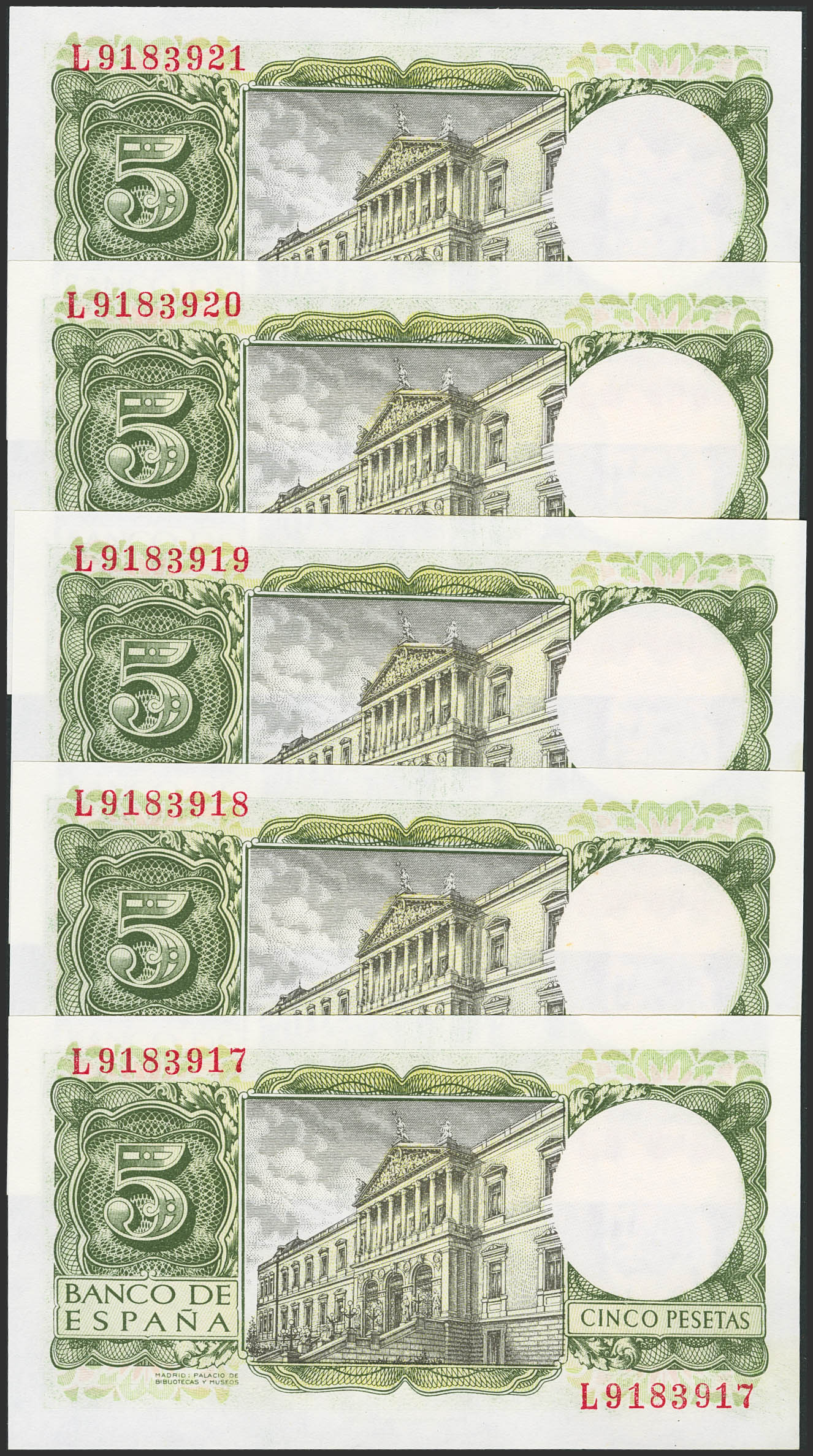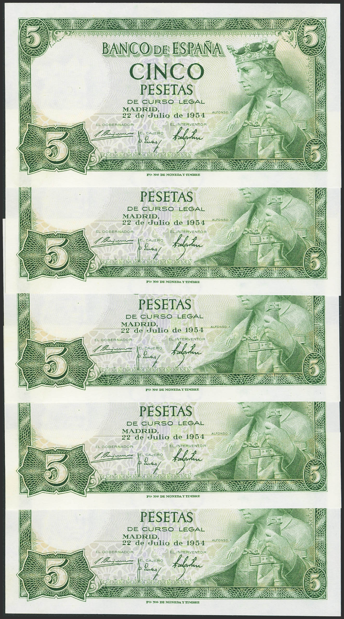 Conjunto de 5 billetes correlativos de 5 Pesetas, emitidos el 22 de Julio de 1954, todos ellos con la serie L (Edifil 2023: 466a), apresto original. SC.