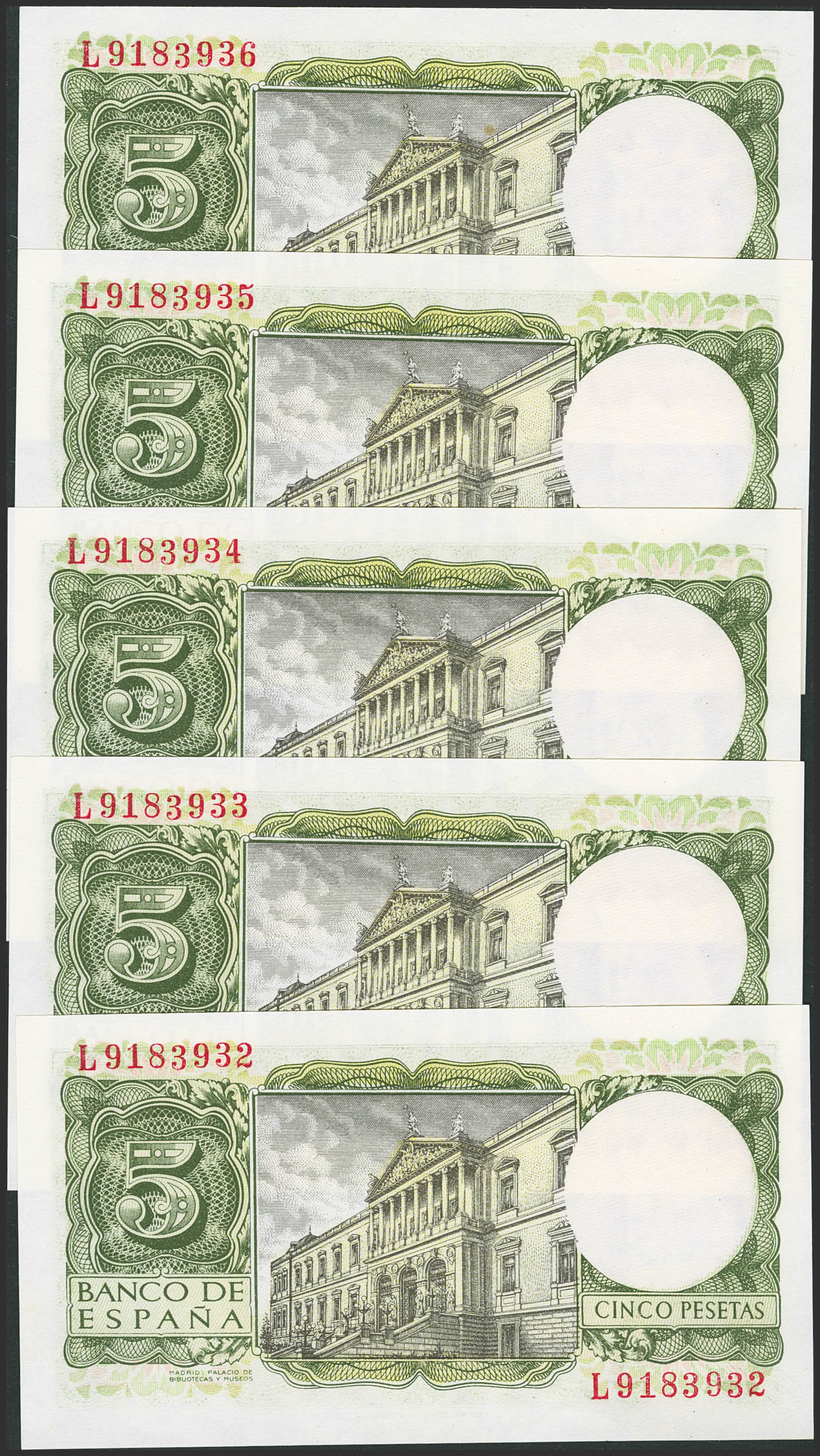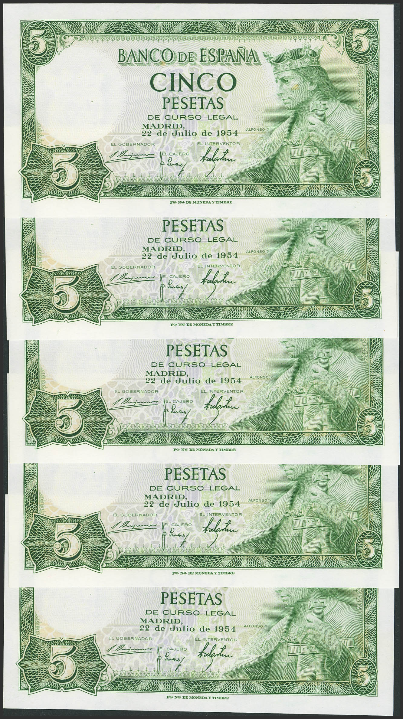 Conjunto de 5 billetes correlativos de 5 Pesetas, emitidos el 22 de Julio de 1954, todos ellos con la serie L (Edifil 2023: 466a), apresto original. SC.