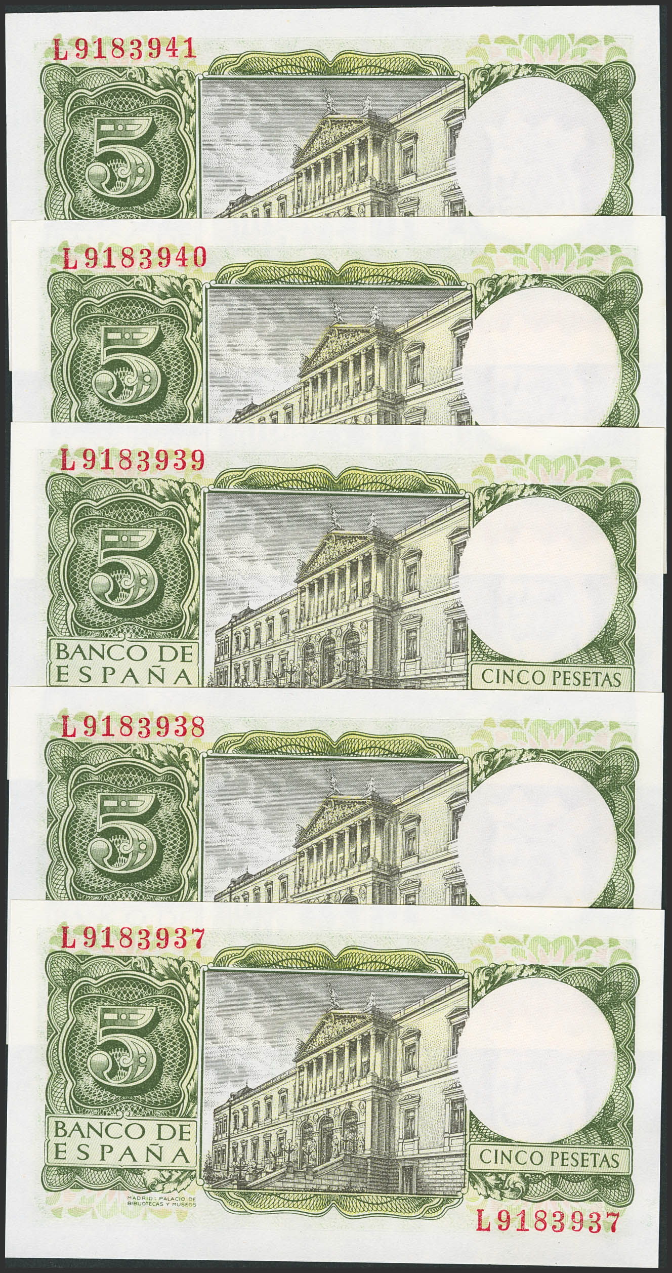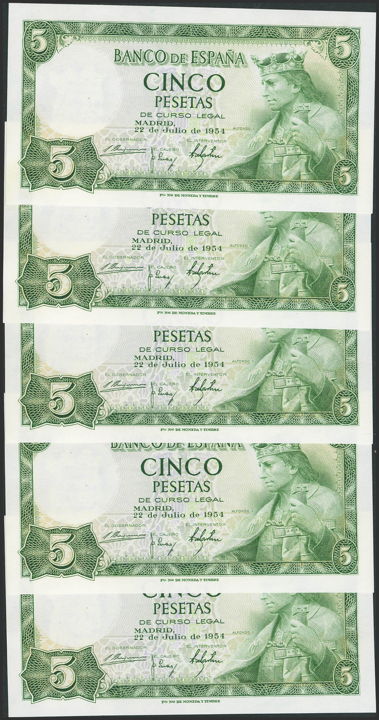 Conjunto de 5 billetes correlativos de 5 Pesetas, emitidos el 22 de Julio de 1954, todos ellos con la serie L (Edifil 2023: 466a), apresto original. SC.