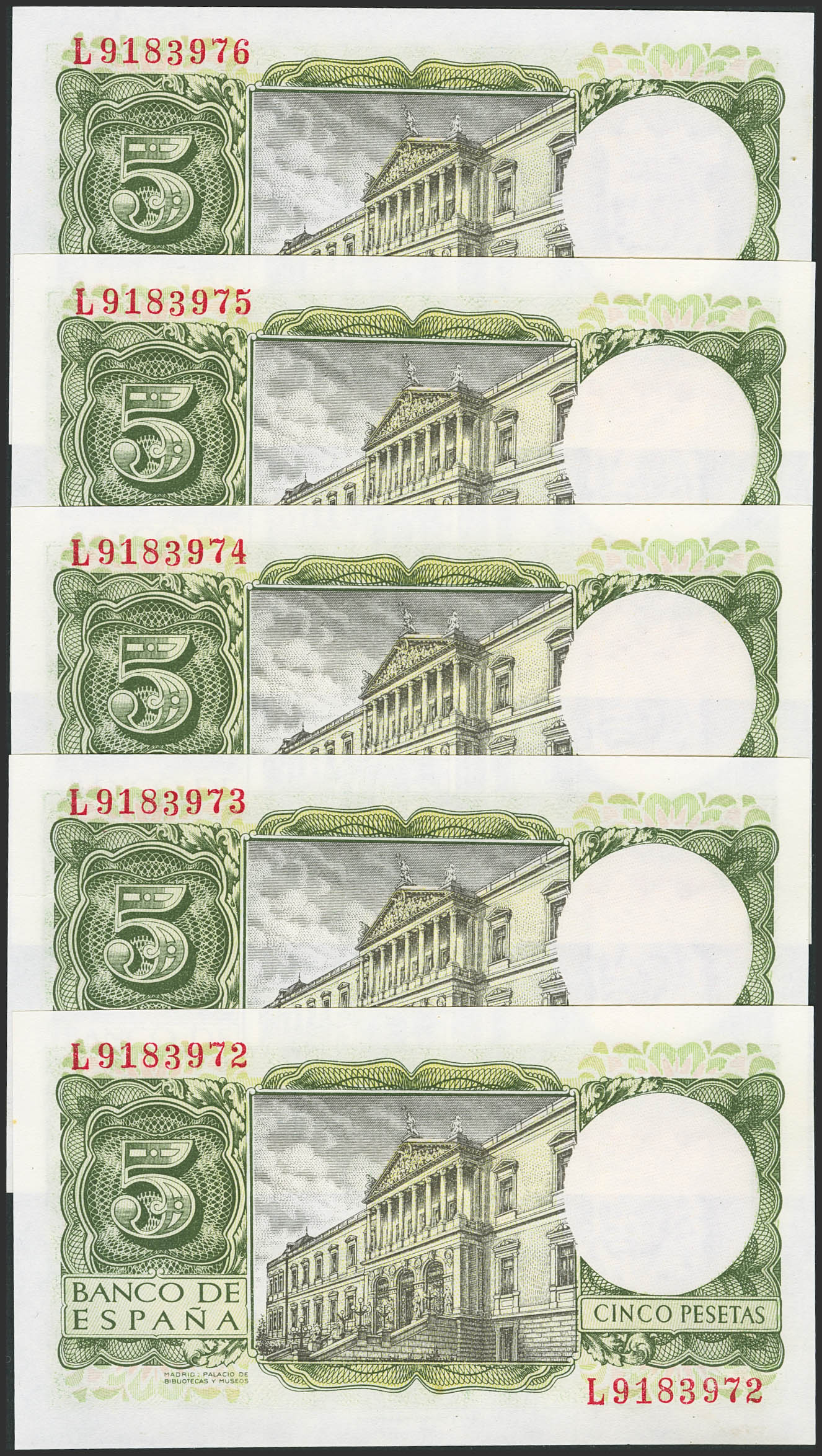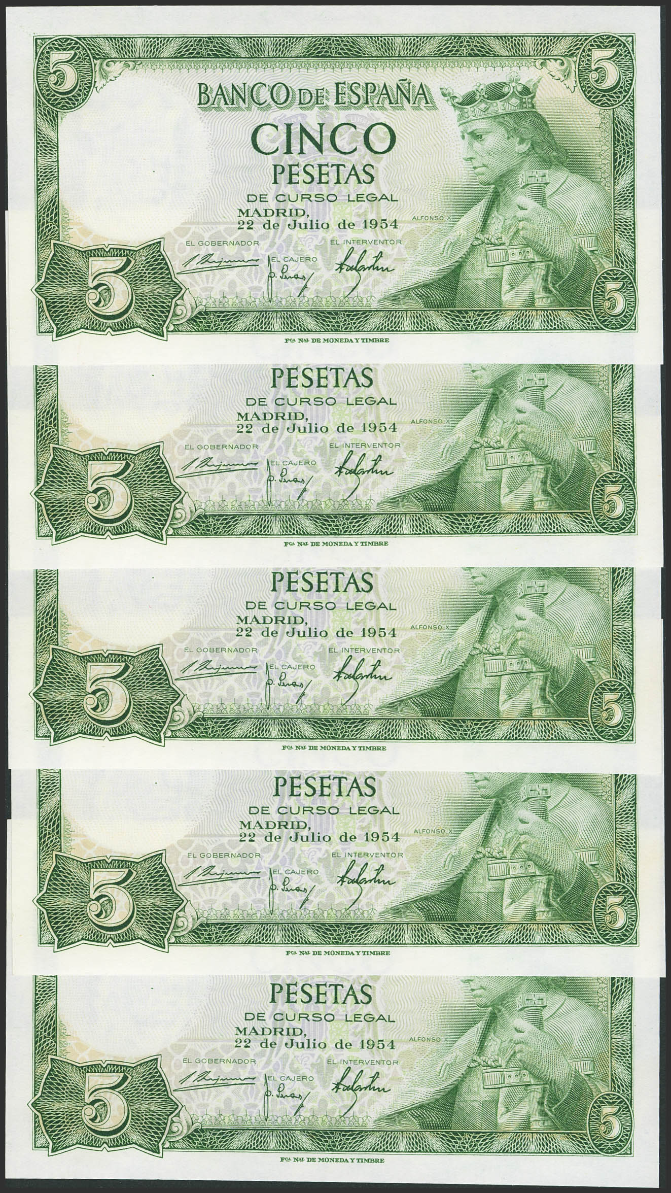Conjunto de 5 billetes correlativos de 5 Pesetas, emitidos el 22 de Julio de 1954, todos ellos con la serie L (Edifil 2023: 466a), apresto original. SC.