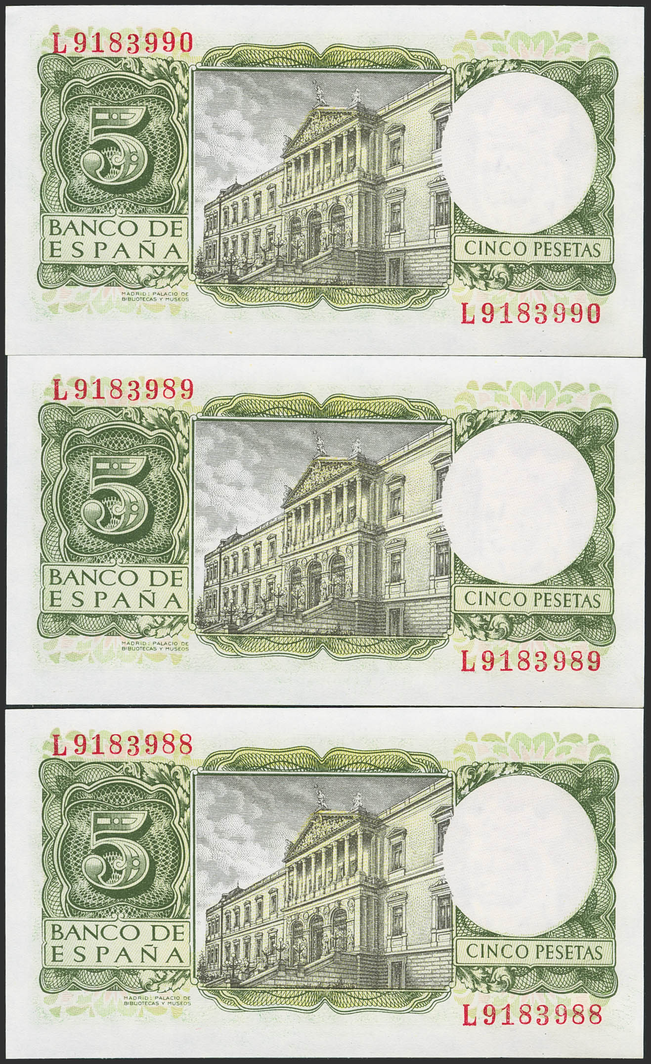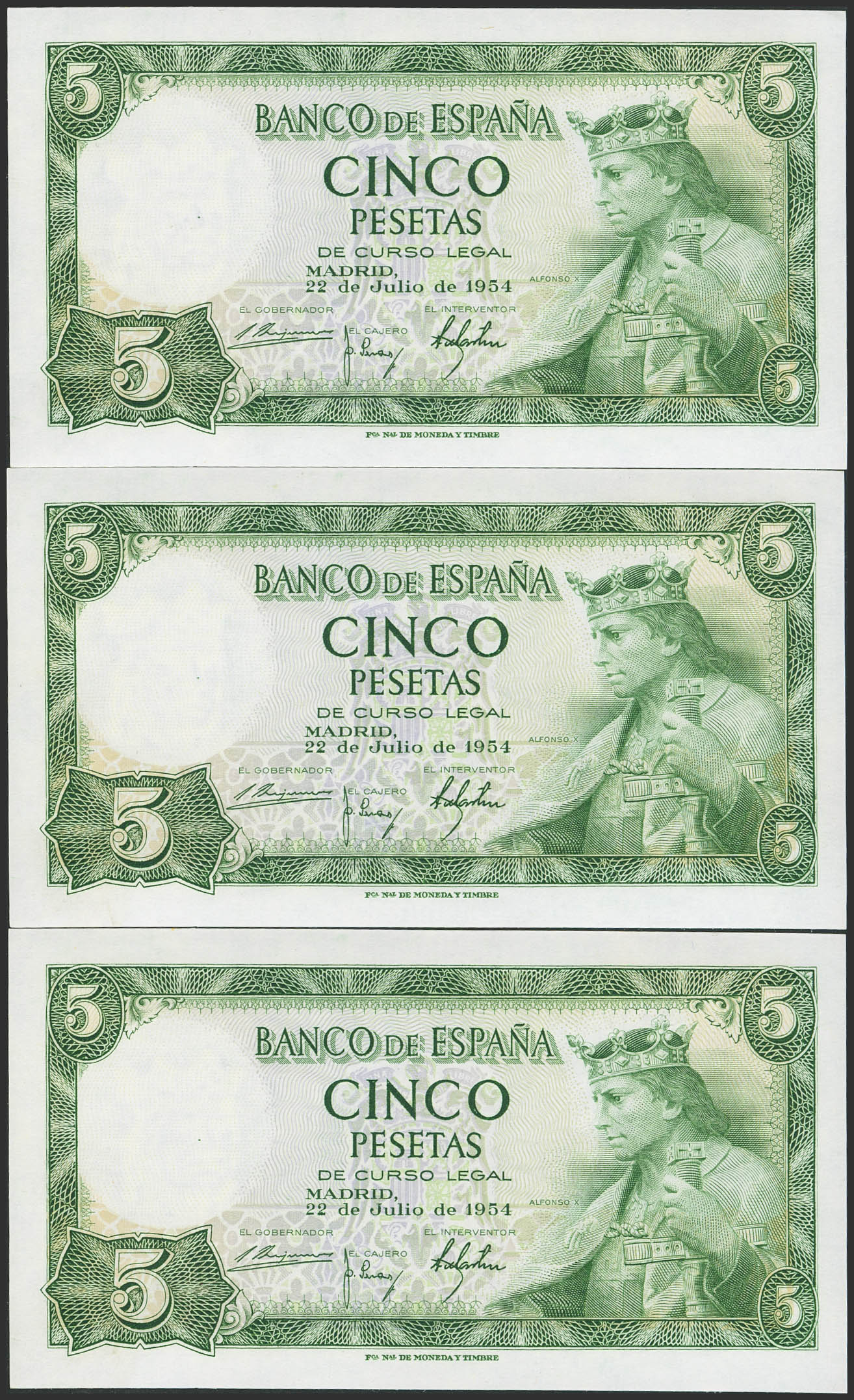 Conjunto de 3 billetes correlativos de 5 Pesetas, emitidos el 22 de Julio de 1954, todos ellos con la serie L (Edifil 2023: 466a), apresto original. SC.
