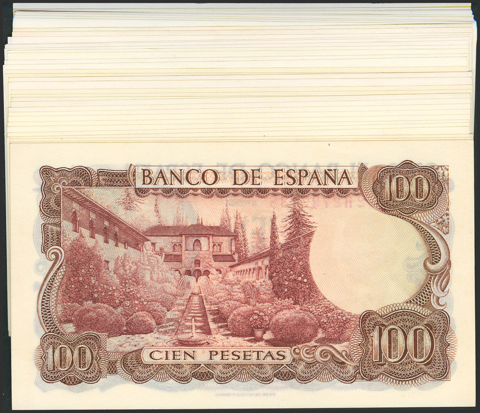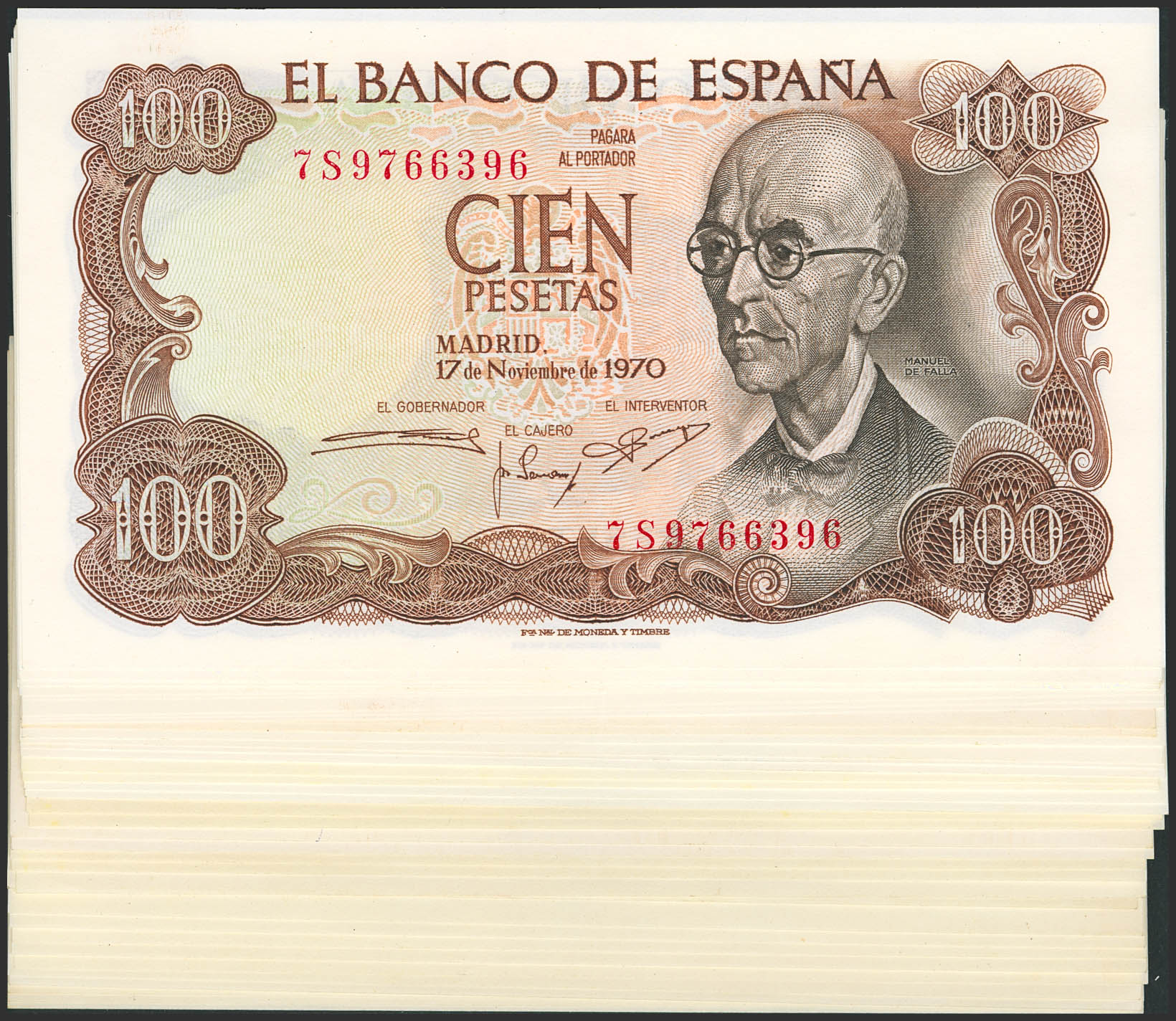 Conjunto de más de 55 billetes, algunos correlativos entre sí, de 100 Pesetas emitidos el 17 de Noviembre de 1970, con diferentes series. (Edifil 2023: 472b). SC/SC--.