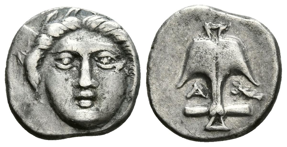 APOLLONIA PONTIKA, Thracia. Dióbolo. Finales del siglo V-IV a.C. A/ Apolo. R/ Ancla, a izquierda A y a derecha cangrejo de río. SNG BM 167. Ar. 1,25g. MBC+.