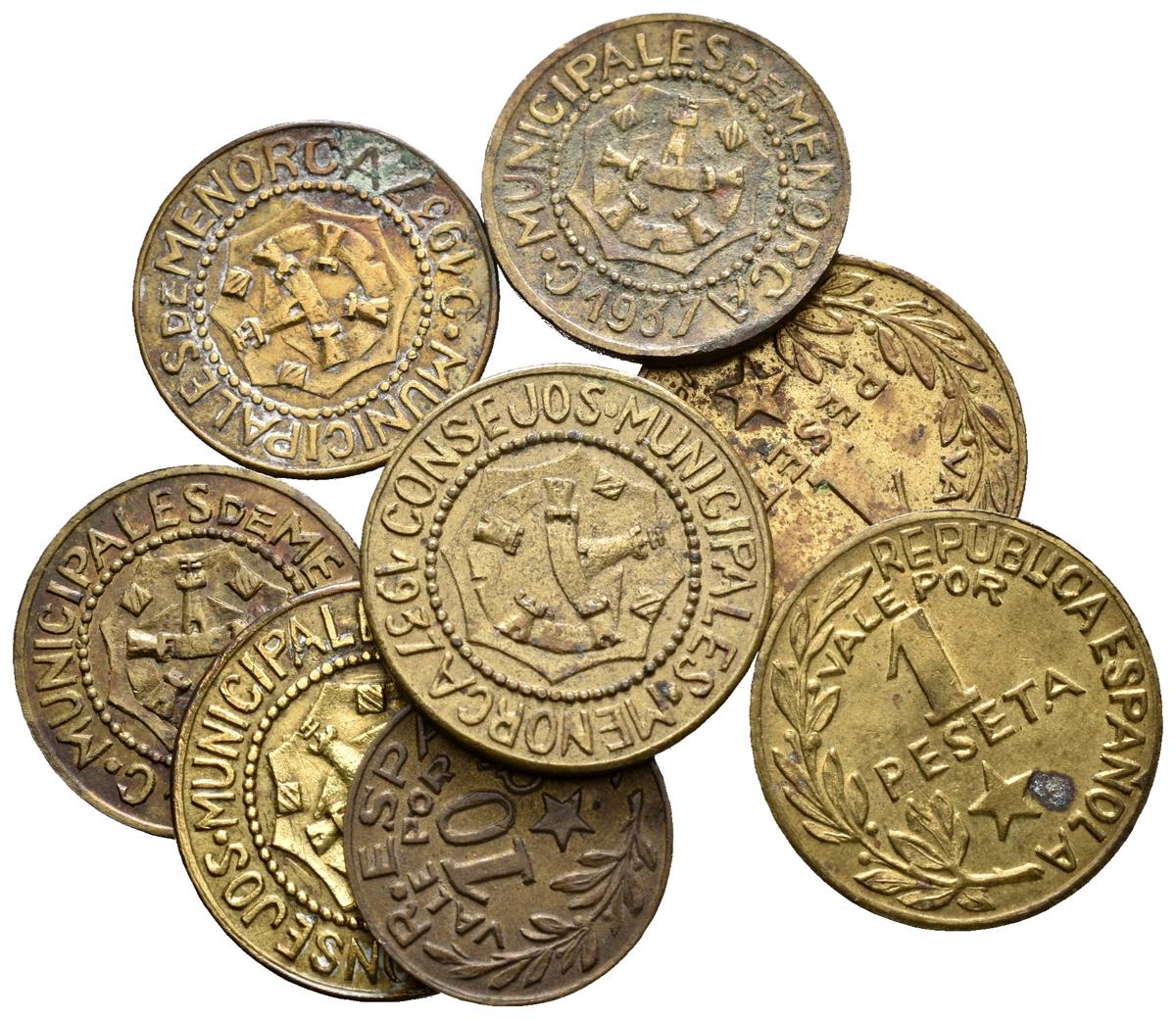 GUERRA CIVIL. Lote compuesto por 8 monedas de Menorca, conteniendo: 1 Peseta 1937 (4); 25 Céntimos 1937 (3) y 10 Céntimos 1937. La. MBC/EBC. A EXAMINAR.