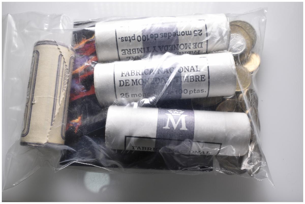 JUAN CARLOS I. Lote compuesto por: Estuche oficial de 2000 Pesetas 1997 y otra en blíster; Cartucho F.N.M.T de 100 Pesetas de 1984-85 y otro con años no visibles y cartucho no oficial de 100 Pesetas 1983 (20 unidades) y pequeño conjunto de monedas diferentes. Todo facial canjeable. A EXAMINAR.
