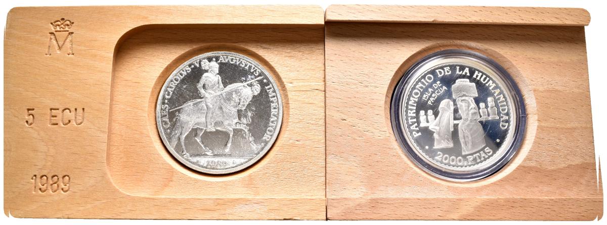 JUAN CARLOS I. Lote compuesto por: 2000 Pesetas 1997 Isla de Pascua, patrimonio de la humanidad y 5 Ecu 1989 Carlos V (yono). Ar. Ambas presentadas en estuche oficial con certificado. PROOF.