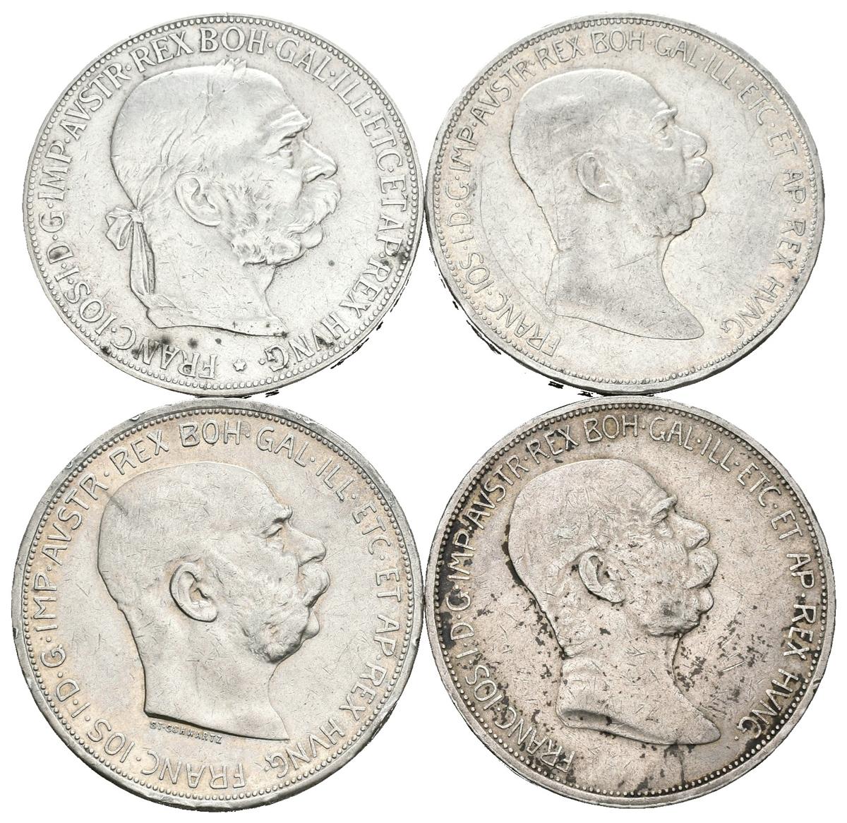 AUSTRIA. Lote compuesto por 4 monedas de 5 Coronas, conteniendo los años 1900, 1908 y 1909 (2 tipos) Ar. BC+/MBC. A EXAMINAR.