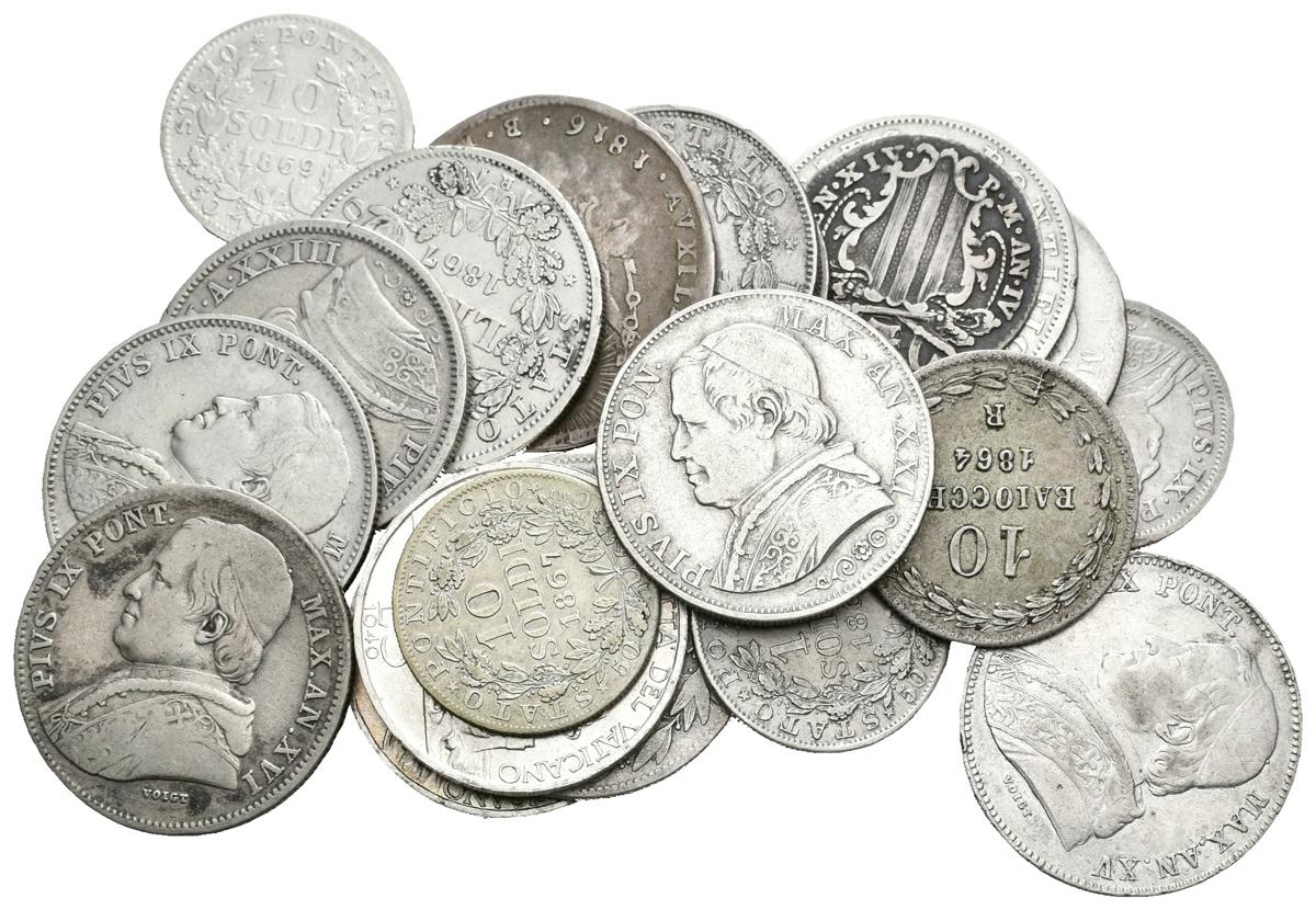 ESTADOS PAPALES. Lote compuesto por 20 monedas de plata, conteniendo: 10 Baiocchi. 1864 R; 10 Soldi. 1867, 1868 y 1869; 20 Baiocchi. 1860, 1861, 1863 y 1865; 1 Lira. 1866, 1867 y 1868; 5 Lira. 1939 y 1940. Incluyen diferentes años. Ar. BC/SC-. A EXAMINAR.