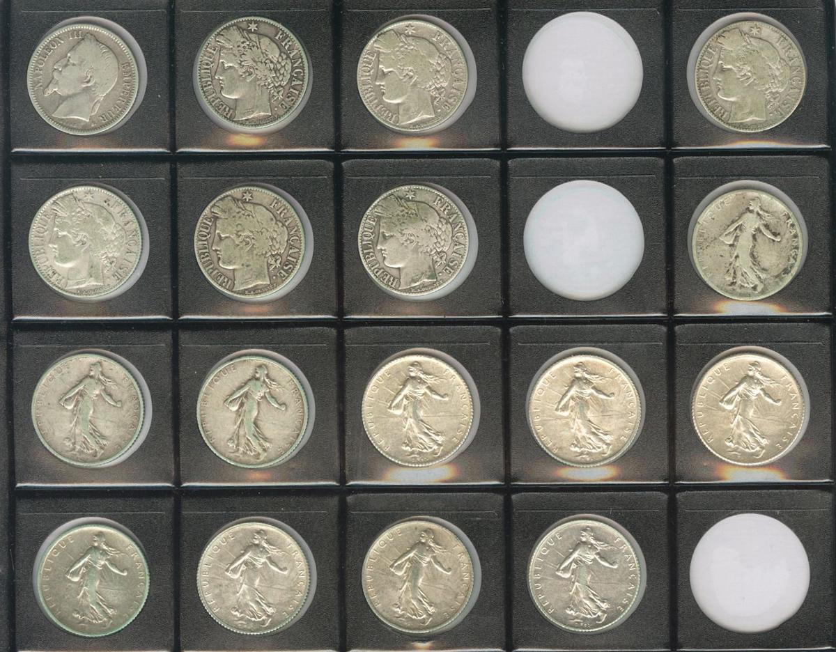 FRANCIA. Lote compuesto por 17 monedas de 1 Franc, conteniendo: 1868 por Naopleón III; 1871 Bourdeaux K; 1872 Bourdeaux K; 1872 París A; 1887 París A; 1894 París A; 1895 París A; 1898; 1905; 1909; 1914; 1915; 1916; 1917; 1918; 1919 y 1920. Ar. BC-/EBC+. A EXAMINAR.