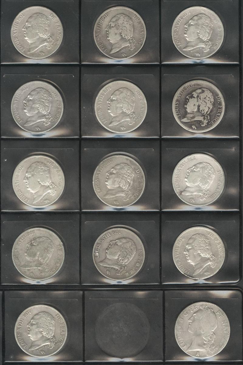 FRANCIA. Lote compuesto por 13 monedas de 5 Francs de Louis XVIII, conteniendo: 1816 Perpignan Q; 1818 Rouen B; 1819 Rouen B; 1820 París A; 1821 Lille W; 1823 París A; 1823 Rouen B; 1823 Bayonne L; 1823 Bourdeaux K; 1824 Rouen B; 1824 Bayonne L; 1824 Lille W y 1824 Toulouse M. Ar. BC+/MBC-. A EXAMINAR.