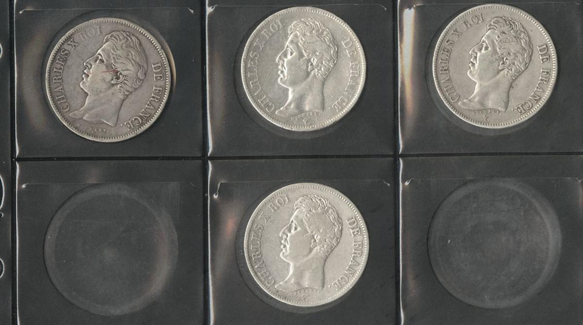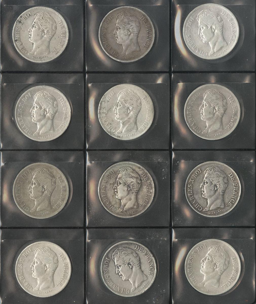 FRANCIA. Lote compuesto por 16 monedas de 5 Francs, conteniendo: 1825 París A; 1825 Lille W; 1826 Lille W; 1827 París A; 1827 Rouen B; 1827 Toulouse M; 1828 París A; 1828 Lyon D; 1828 Bayonne L; 1829 Lille W; 1829 Limoges I; 1829 Bourdeaux K; 1830 París A (2); 1830 Lyon D y 1830 Bayonne L. Ar. BC+/MBC. A EXAMINAR.