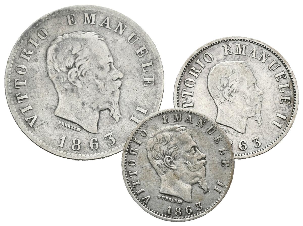 ITALIA. Lote compuesto por 3 monedas, conteniendo: 20 Centesimi 1863 M; 50 Centesimi 1863 M y 1 Lire1863 T. Ar. A EXAMINAR. Escasas.