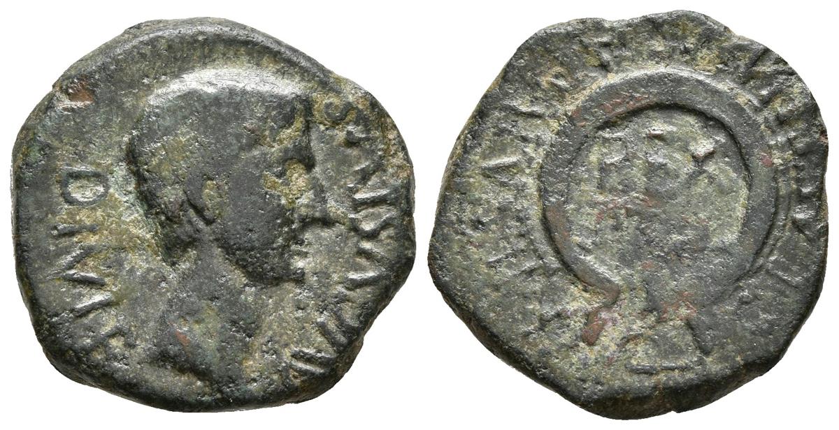 CARTAGONOVA. Semis. Epoca de Augusto. 27 a.C.-14 d.C. Cartagena (Murcia). A/ Cabeza desnuda de Augusto a derecha. AVGVSTVS DIVI F. R/ Láurea. REX. PTOL. C. LAETILIVS APALVS II V. Q. FAB-590. Ae. 4,77g. MBC/BC+.
