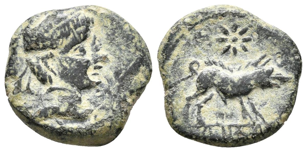 CASTULO. Cuadrante. 180 a.C. Cazlona (Jaén) A/ Cabeza masculina a derecha. R/ Jabalí a derecha, encima estrella, debajo CaSTeLE. FAB-735. Ae. 2,60g. MBC-.