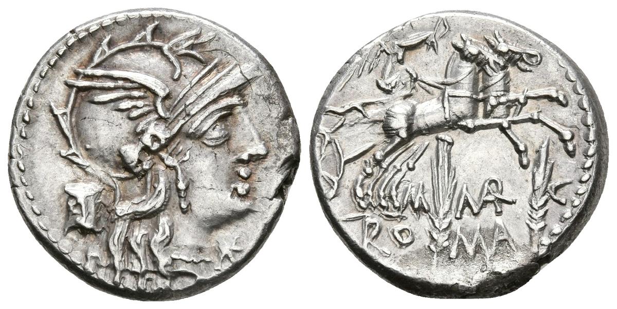 M. MARCIUS. MN. F. Denario. 134 a.C. Roma. A/ Busto de Roma a derecha, delante signo de valor y detrás modio. R/ Victoria llevando biga a derecha, debajo dos espigas y entre ellas M.MAR. C, en exergo ROMA. Craw 245.1; Sydenham 500; Marcia 8. Ar. 3,87g. Buen ejemplar. EBC+.